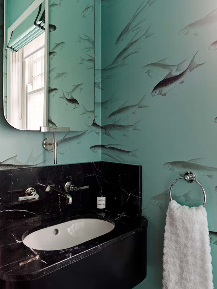 For the formal parlour, Carden Cunietti’s paint brushes were dipped in moody inky hues. The colour transformed the light-filled room into a glamorous nighttime hangout. In line with the bold colour journey, across the hall the study is completed in Hermes orange with black cerused oak bookcases. A powder room is finished in De Gournay wallpaper and a Nero Marquina marble basin.