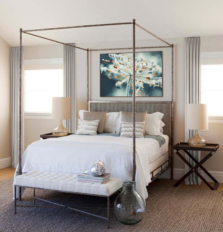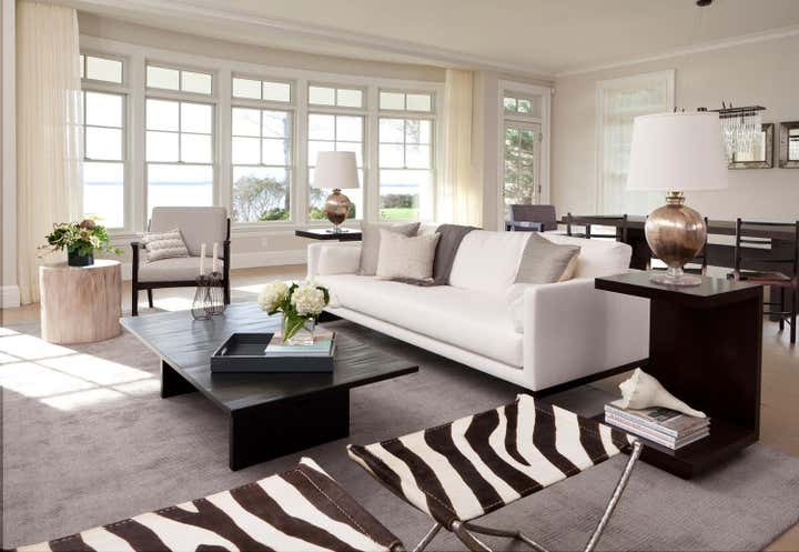 Flooded with light, the living room’s spare cream and gray palette plays nicely against the dark wood tones used throughout. A pair of zebra print stools bring a bold pattern into the room. The master bedroom is a peaceful sanctuary filled with calming tones and refined furnishings. Whimsical details in a dreamy girl’s bedroom and a nautical-inspired boy’s room round out this charming coastal retreat.