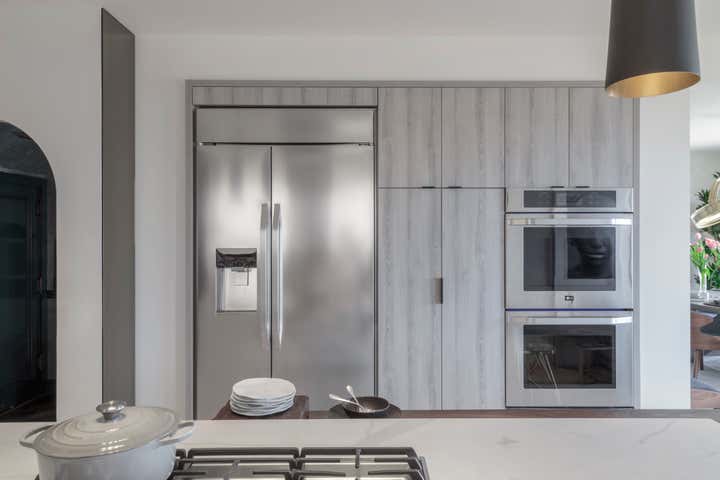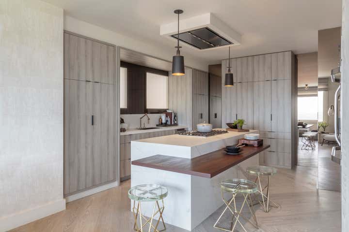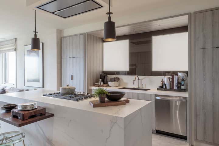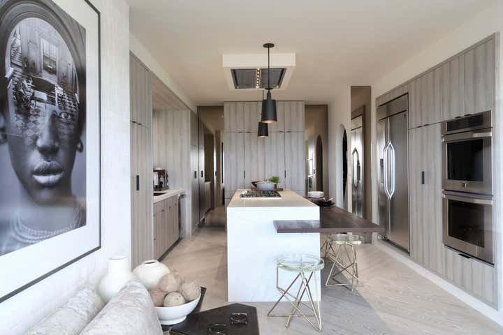 The dining room sets the stage for luxurious entertaining. Soft hues of smoke and limestone juxtapose with charred black, bronze and brass. A breath away, the family lounge opens to welcome you to relax and watch a movie on one of your devices. Next stop is the pared-down, streamlined kitchen. Smoky tones envelop the space, concealing all storage, and shimmers of mirror and glass reflect the natural light. All the spaces combine to create the epitome of real and modern living in today’s world.