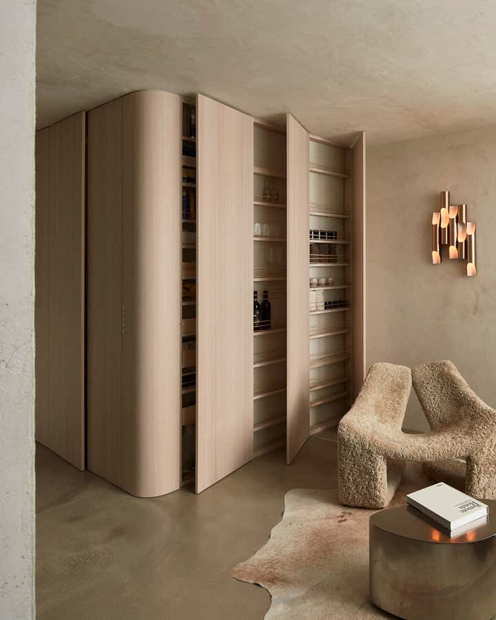 Both sides from the cube hide narrow shelves that provide enough storage for folded textiles, kitchen utensils and other bits and bobs.