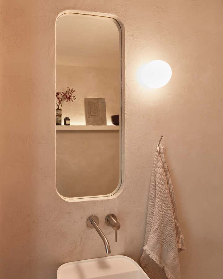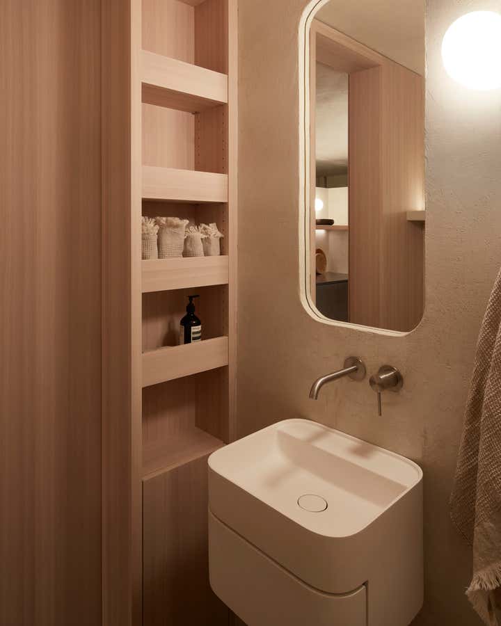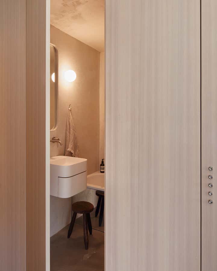 Concealed inside the wooden cube of white oiled larch is the mini bathroom. Also fit with spackled walls. The highlights of this hidden gem are the spackled mirror and tinted mirror surface on the bathtub, which visually opens up the space.