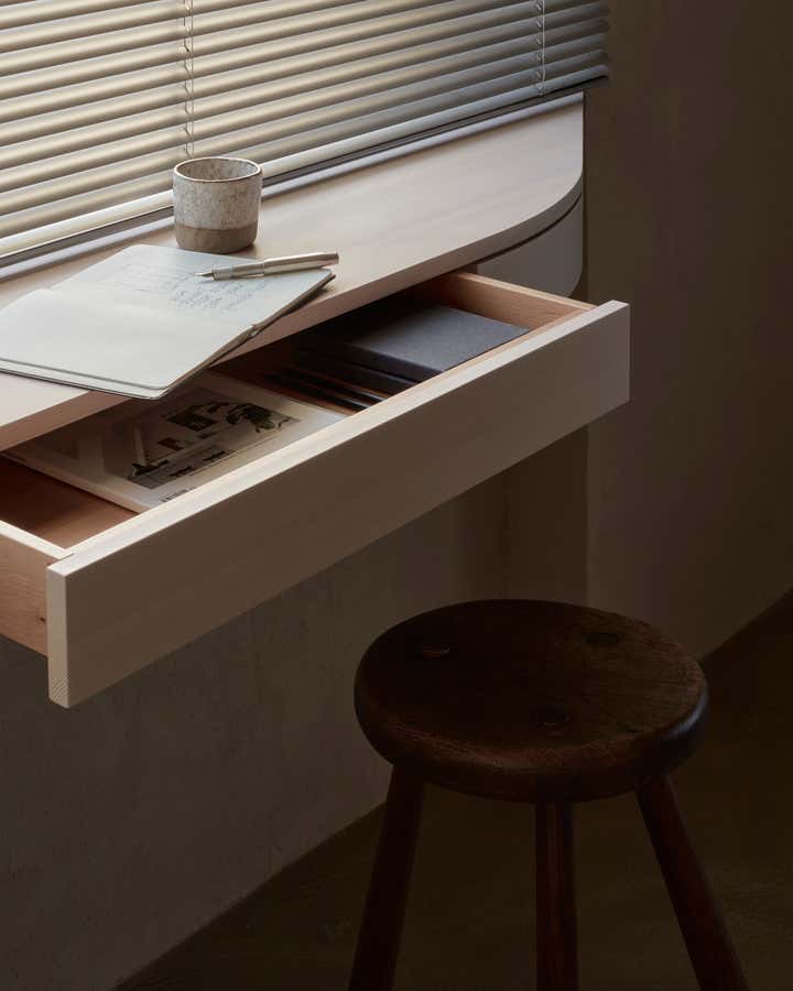For idling, eating and working, a narrow bar-height desk with drawers was designed spanning the large window.