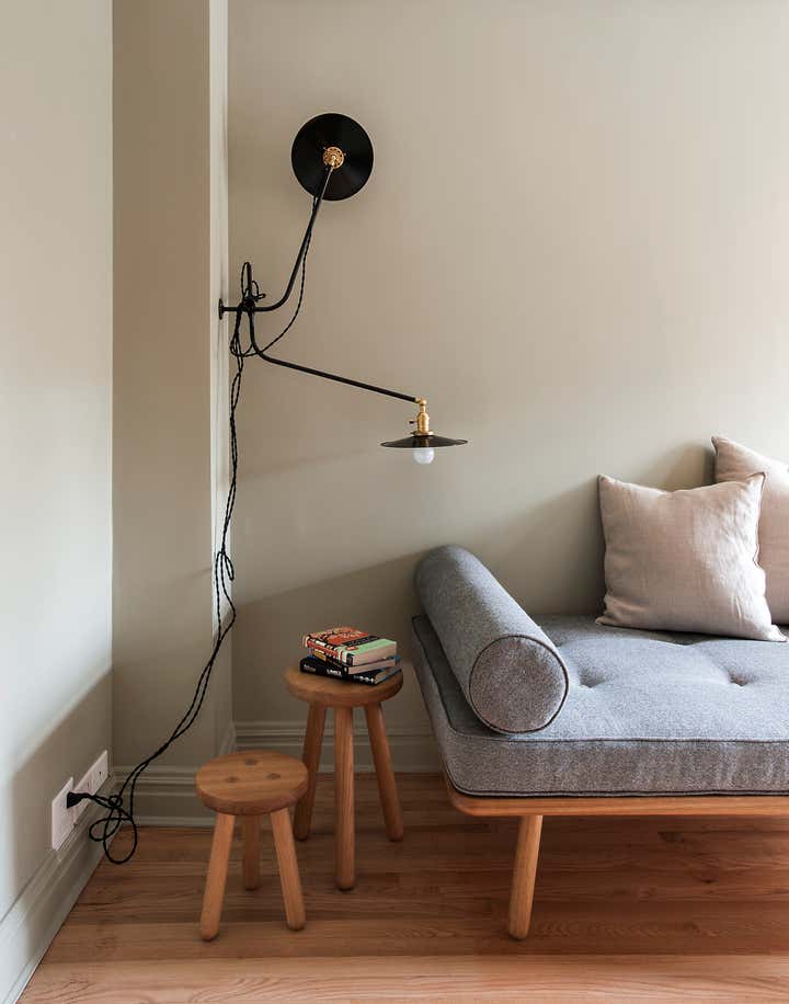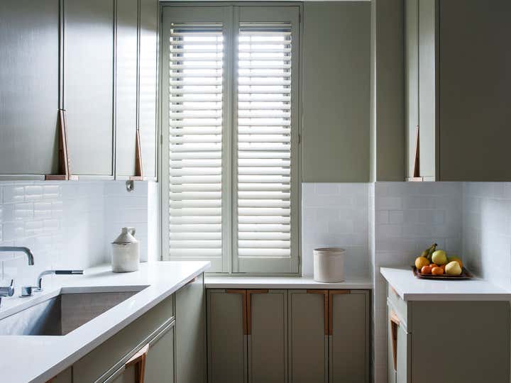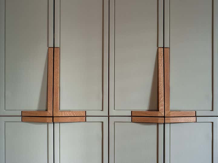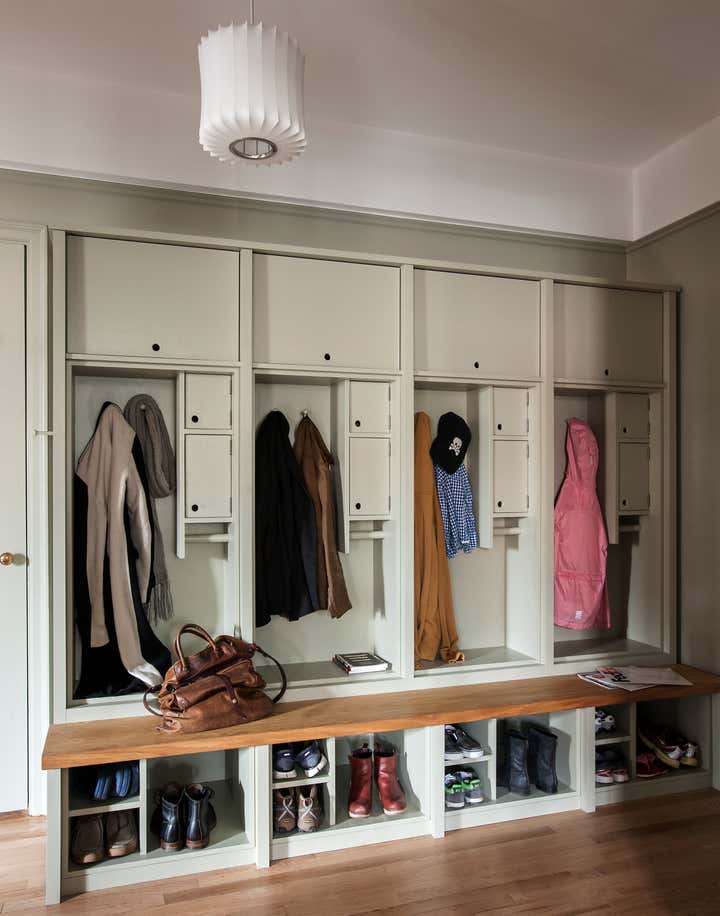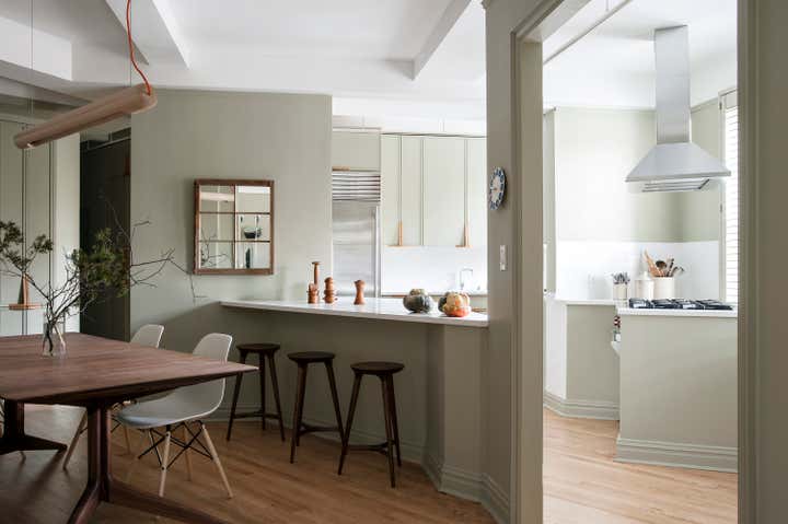This project included the refinishing of a 1928 pre-war apartment in the Rosario Candela – designed 47 Plaza Building on Prospect Park in Brooklyn. All of the original trim and moldings, as well as new casework, were painted to match. The original floors were sanded, and new custom wooden handles were added to the casework throughout. The handles are carved to emerge from the flat doors to allow the hand to comfortably grip each cabinet. Throughout the project there is a subtle play of light as the French Gray color changes throughout the day, while the solid wood elements fuse the new and the old. A modern sensibility is created within the context of the prewar vocabulary of this landmark Brooklyn building.