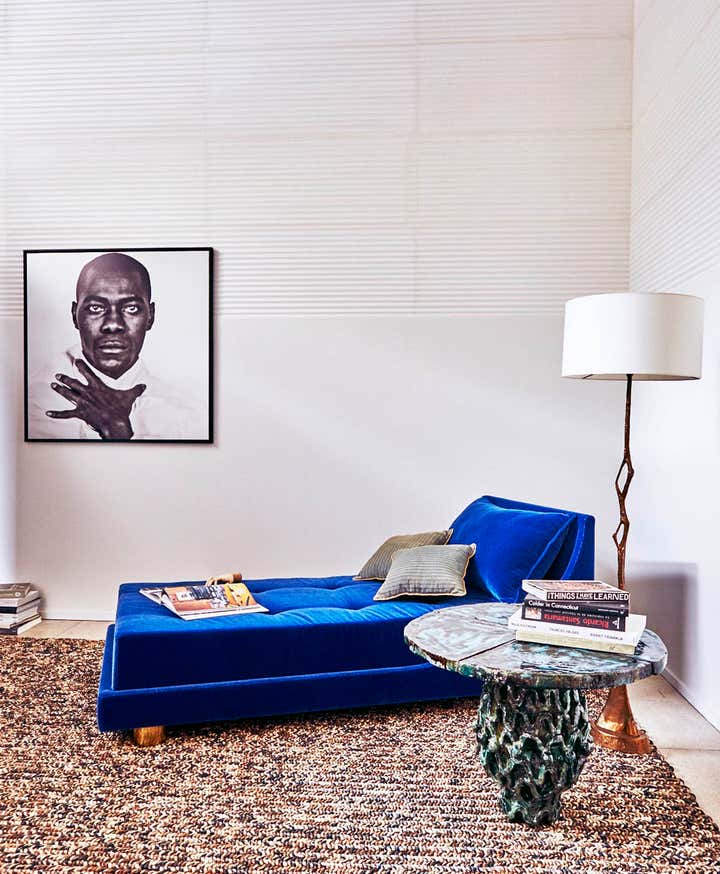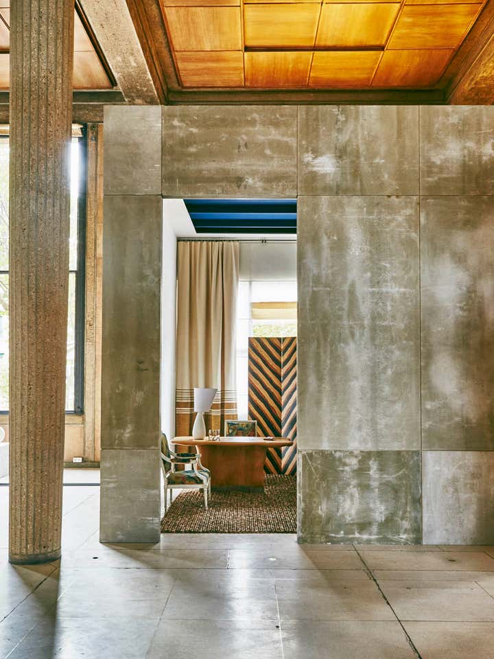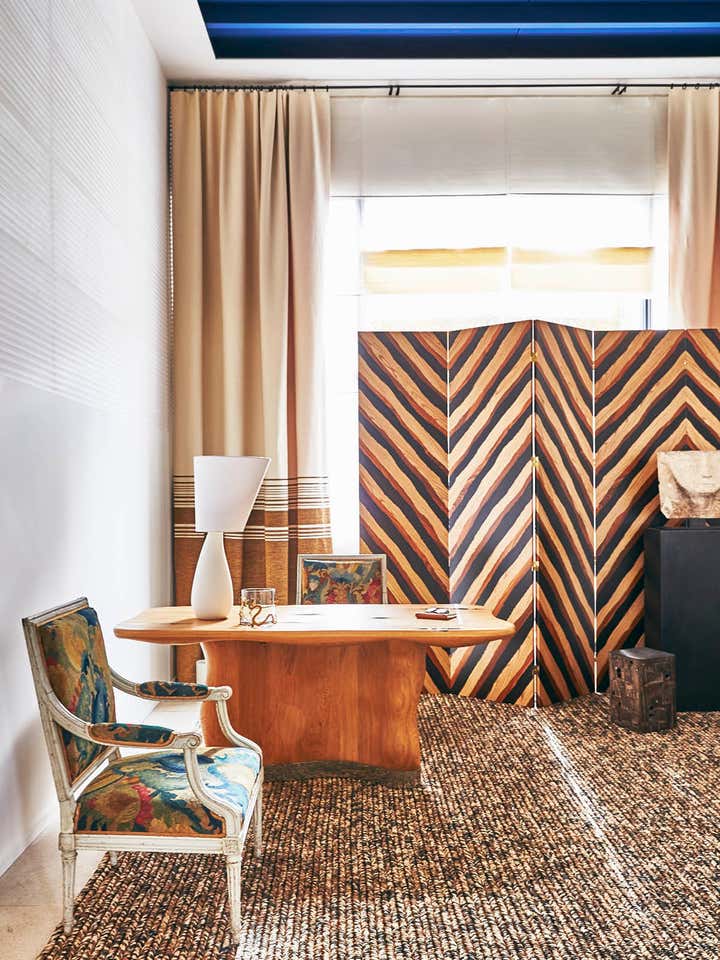 For AD Interiors Show in Paris, Suduca & Mérillou created a space for oneself, an egoistic space, a space to stand back. No screen, no electronics. A desk in wood and curvaceous, a sumptuous comfort daybed , a precious screen for protection from the outside. Few art objects, but magnificent, from all periods. In a space made of simple materials but wrought with skill by the best craftsmen: carved plaster walls, floor braided rope, woven cotton curtains, bespoke Galerie Saint Jacques.