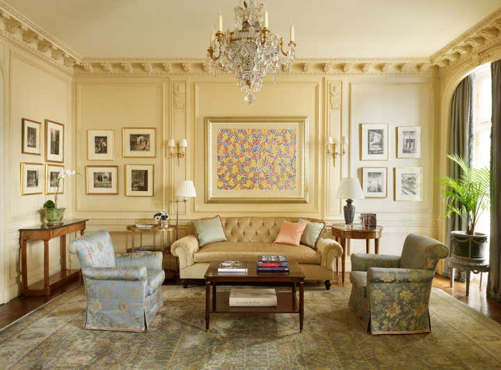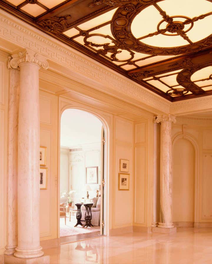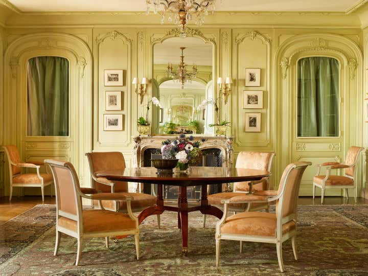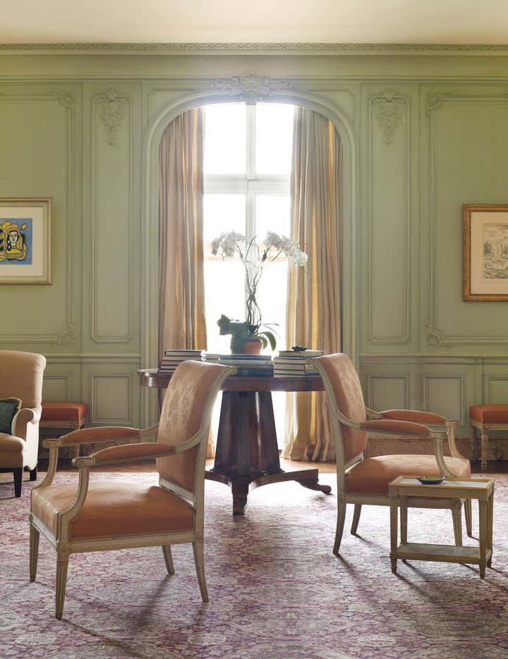 A grand apartment in the French taste is transformed with new colors that highlight the best of its architectural features. These grand rooms are located in a building by McKim, Mead & White, one of the first luxury apartment building on Fifth Avenue. The striking features of this apartment are the Beaux-Arts stone entry hall and reception room as well as the dining room, the living room, and the study walled in French boiserie, which are thought to be by the famous French decorator Stephane Boudin. Although our clients were not Francophiles and had more contemporary taste, they chose to build upon the apartment’s best attributes rather than gutting the place. The rooms were originally richly polychromed and gilded and we suggested that color would take the edge off the grandeur and make everything more welcoming. After planning and careful consideration, we decided to repaint the walls in shades of blue and green with a strié finish.