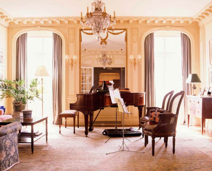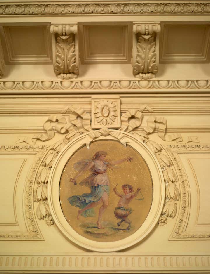 We furnished the drawing room with an array of comfortable seating, including upholstered sofas and chairs, benches, and a handsome suite of fauteuils (French open armchairs) with old white paint by the famous French chair maker Jacob. These helped strike the right balance in the rooms between the old and new.