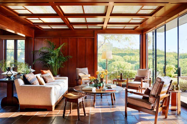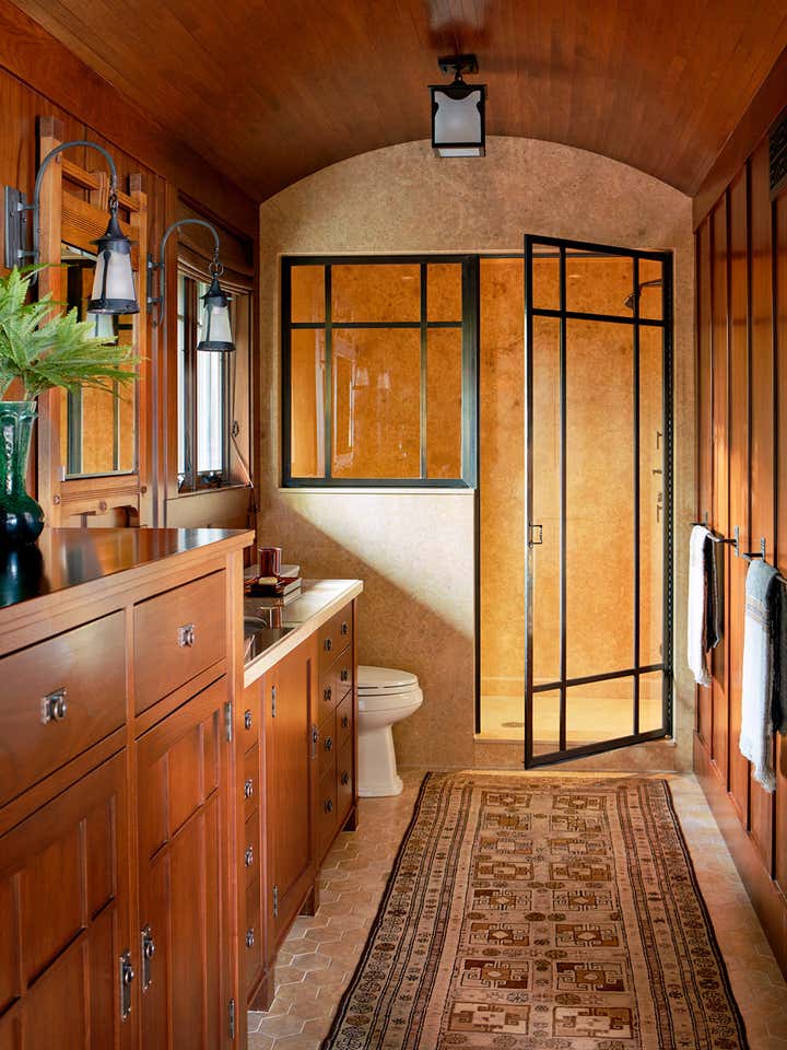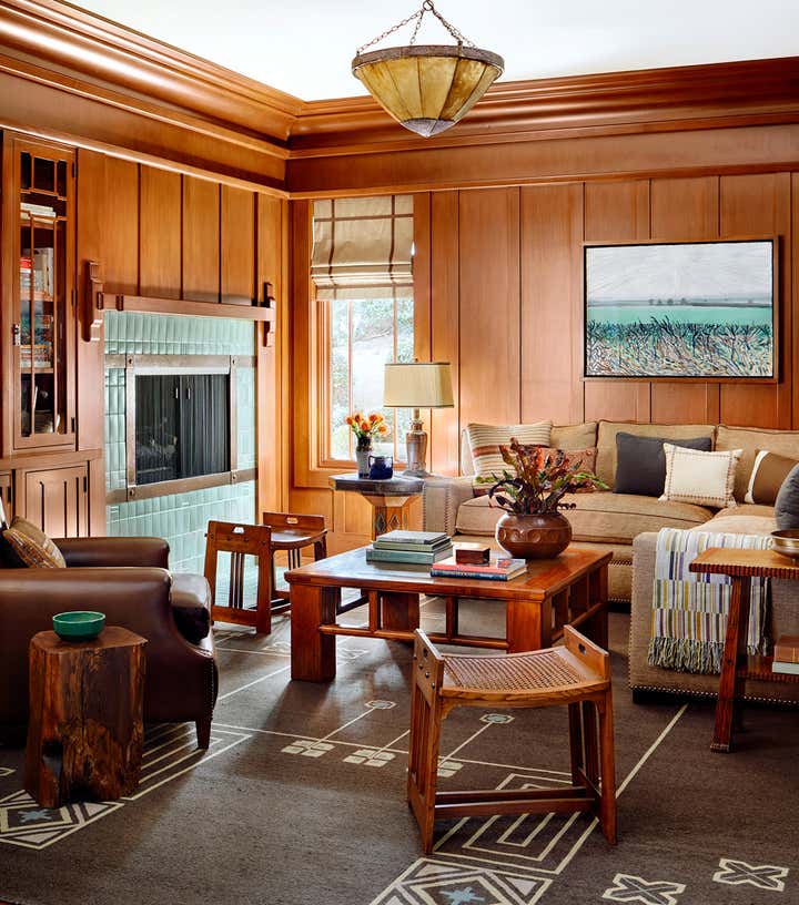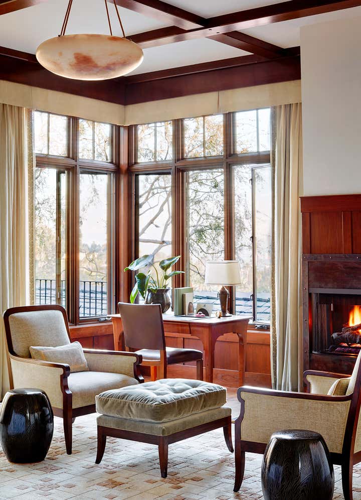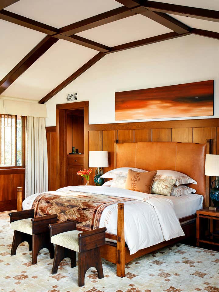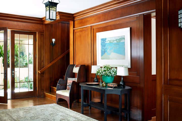 A modernist interpretation of classic bungalow style architecture, this residence features traditional Arts & Crafts details and an eclectic collection of furniture from the early part of the 20th century.