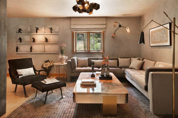 This contemporary Aspen house with Greystone floors, Venetian plaster walls and blackened steel throughout creates the perfect setting to appreciate the spectacular mountain views. The remarkable art collection mixed with vintage and contemporary furniture create playful yet stunning interiors.