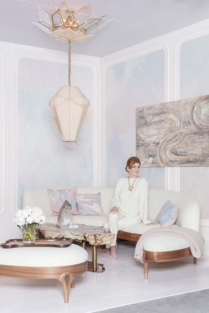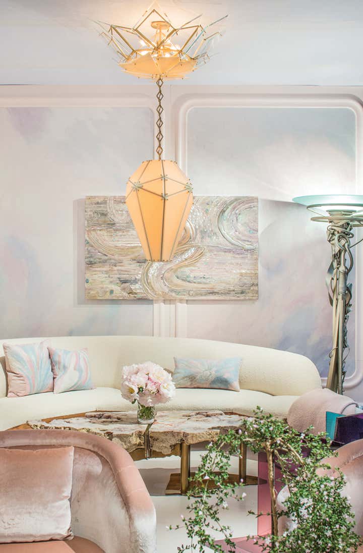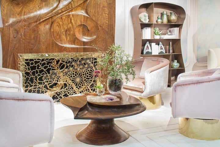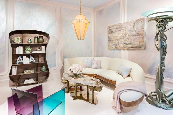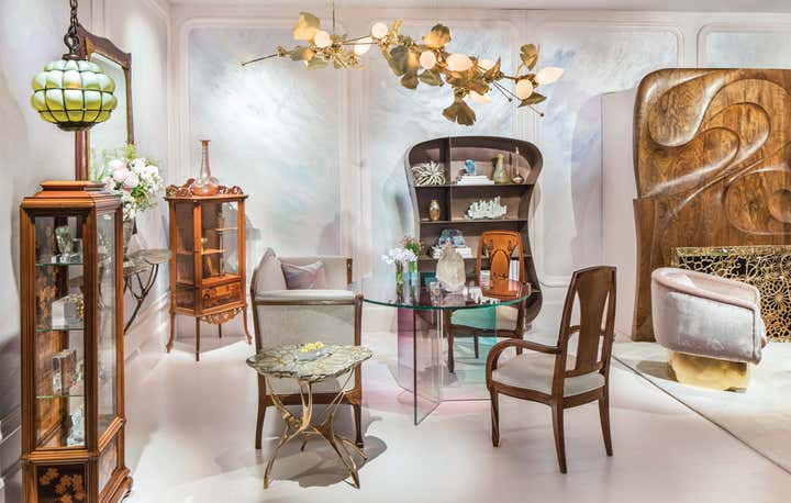 At the heart of the atmosphere by Amy Lau installation is Michael Coffey’s sculptural walnut fireplace facing, paired with a bespoke bronze and porcelain fireplace screen by David Wiseman. Calico Wallpaper’s custom hand painted mural wall panels inspired by metallic luster glazes and decorative moulding details surround the space in a custom rose quartz color. Iconic furnishings from the Art Nouveau period to contemporary design heirlooms by Germans Ermics, Mark Brazier-Jones, Mary Wallis, and Xavier Lust are highlighted. All upholstered items are covered exclusively by Dedar fabrics, accessories such as ceramics, glass objects, and mineral specimens are also displayed, including an historic, immense 307 carat Burle Marx Brazilian Crystal Opal and 18 karat gold necklace.
