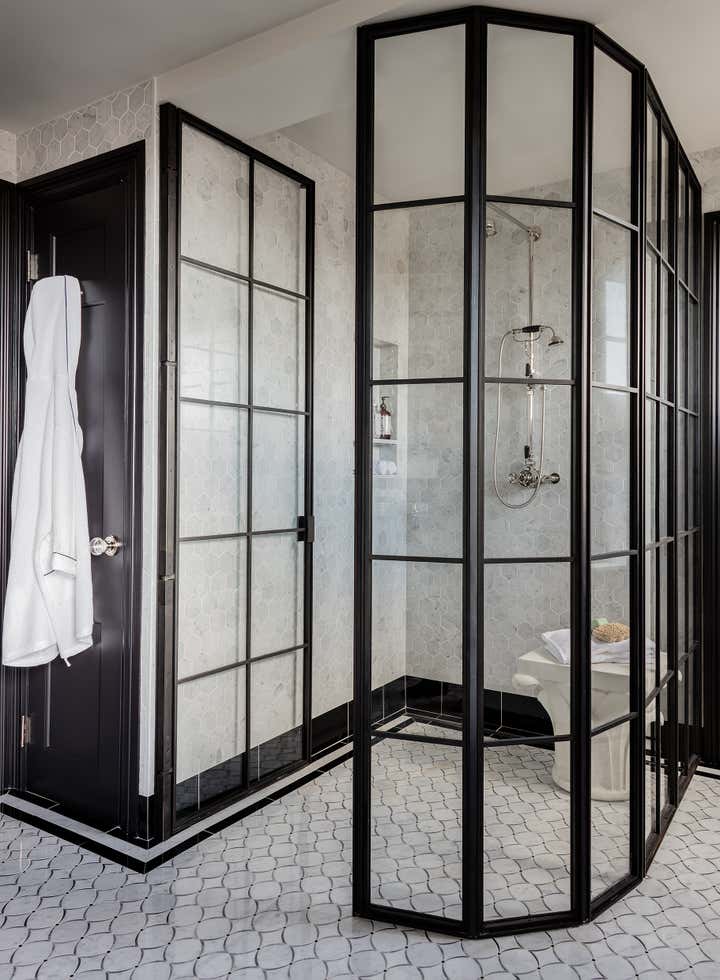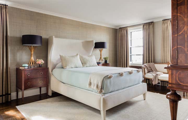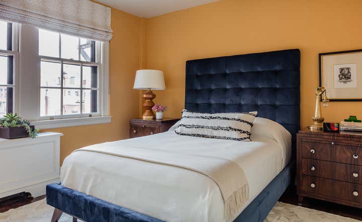 The master bedroom, a calm respite from the hustle of the city outside – yet still dog-friendly enough for their two high-spirited dogs, who happen to be welcome on the bed.