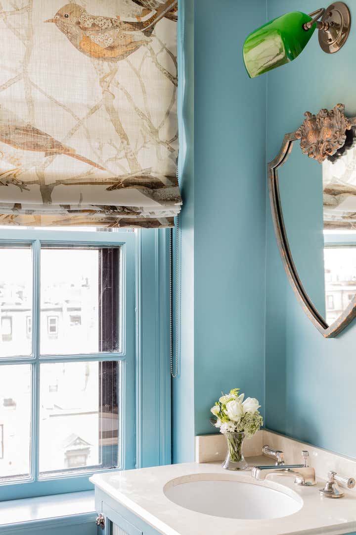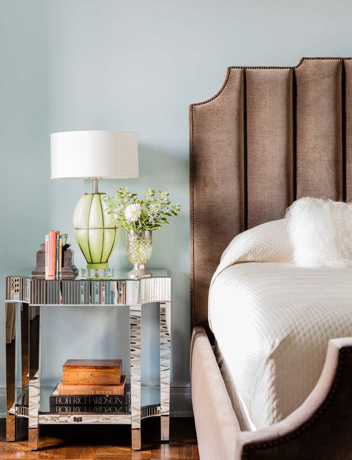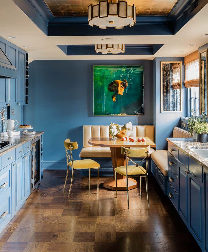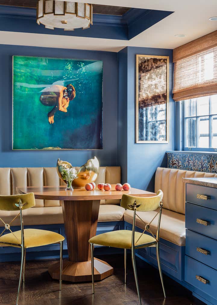 The kitchen -- used as much for catering as for an after-midnight grilled cheese sandwich after a night on the town – was designed to have a sexy, after-hours club feel to it. This kitchen was meant to be enjoyed by candlelight while tucked into the warm honey leather upholstered corner seating area, sipping on a dry Manhattan. Prussian Blue painted cabinetry, custom table, reflective gold wallpaper on the ceiling.