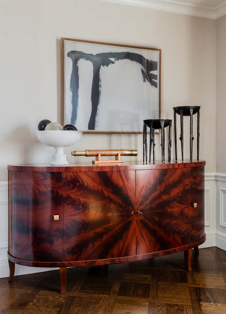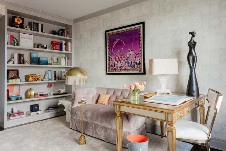 The home office was meant to feel more like a Parisian boudoir than a corporate workplace. A silk Tibetan carpet, a vintage Emilio Pucci scarf framed and hovering over the soft velvet sofa; a room filled with books and sculpture.