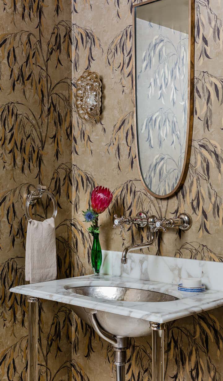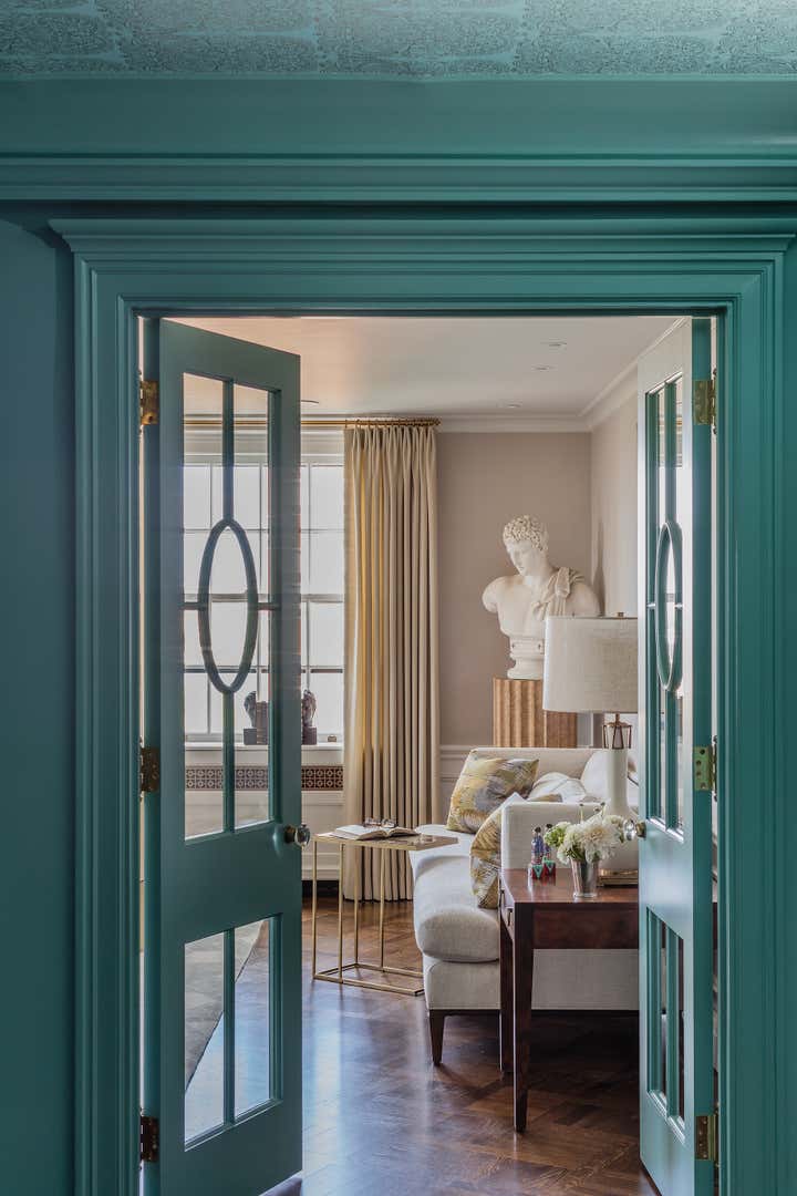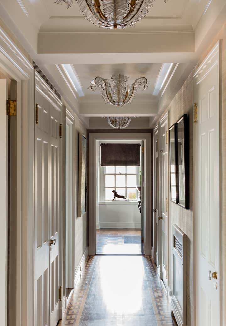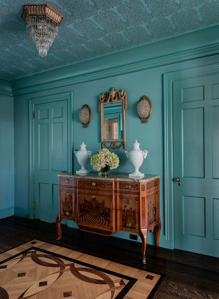 The entry hall is kept intentionally simple. The elegant walls and moulding are drenched in “Sugar Bag Light” Farrow and Ball paint, hand-painted green and gold wallpaper on the ceiling, supported by an intricate marquetry inlaid floor. The only remaining element from the original house is the 1930’s crystal and brass ceiling light fixture, unmoved from its original location.