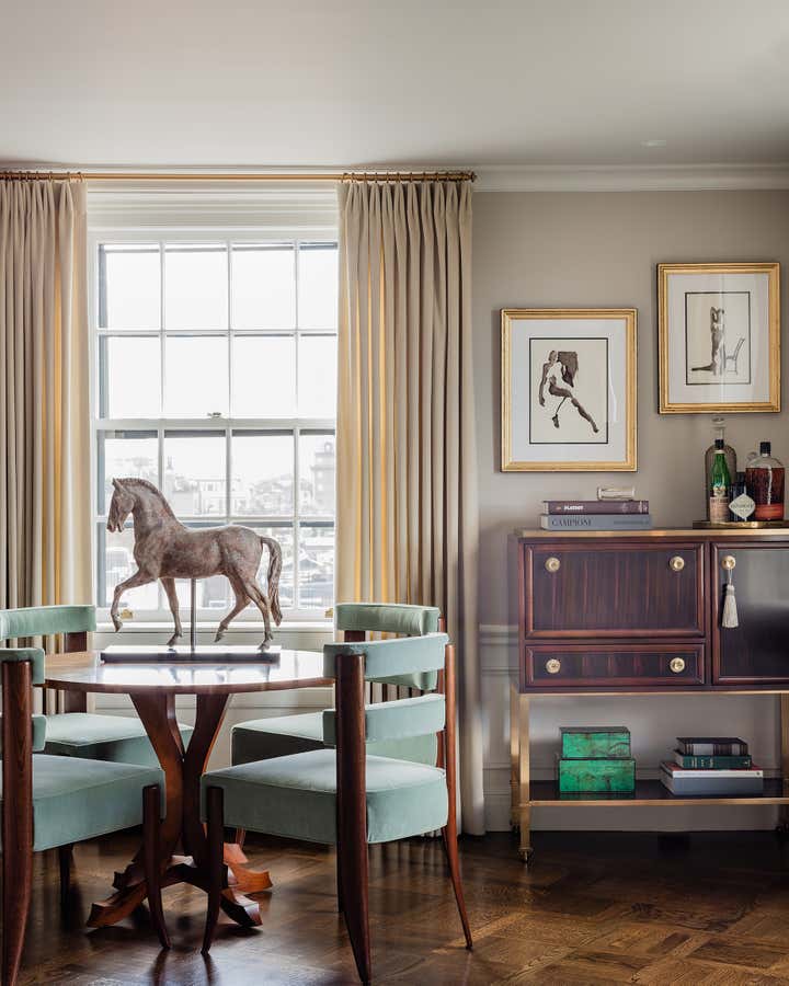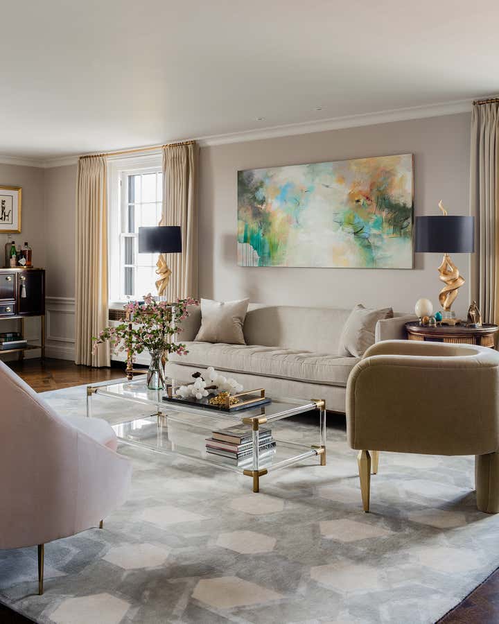 The main living room has an abundance of comfortable upholstered seating in French linens and luxurious mohair, a game table, a bar, art - a mix of abstract and traditional - carefully curated from a large variety of 1st Dibs vendors.