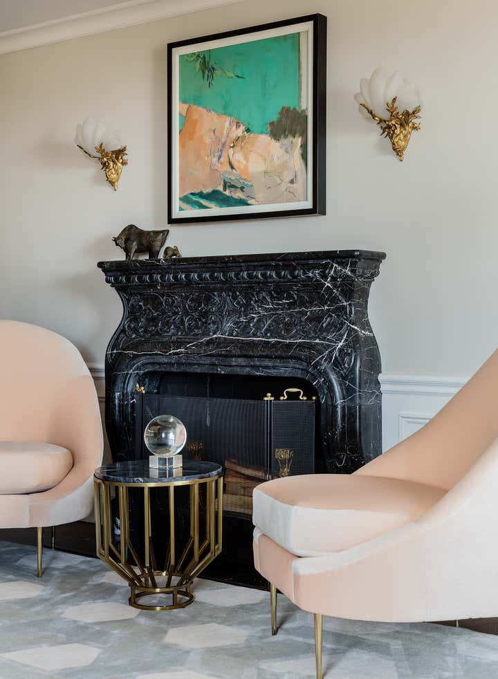 A simple, quiet color palette of pale blush, greens and oat were chosen for the living room; contrasting with the charcoal grays and heather in the den.