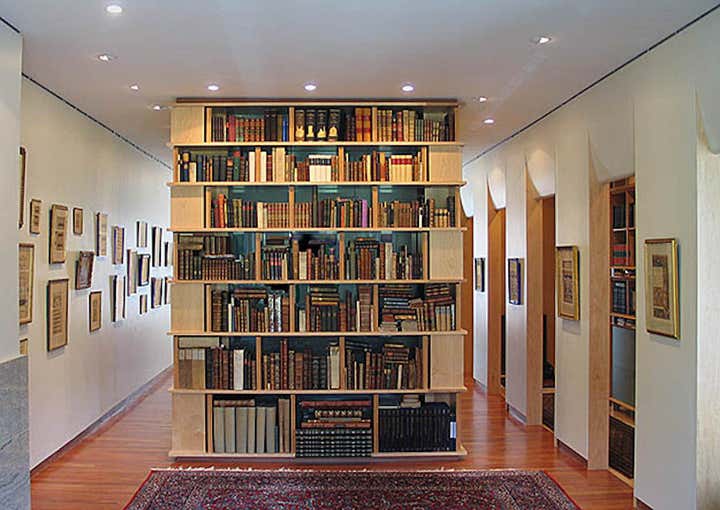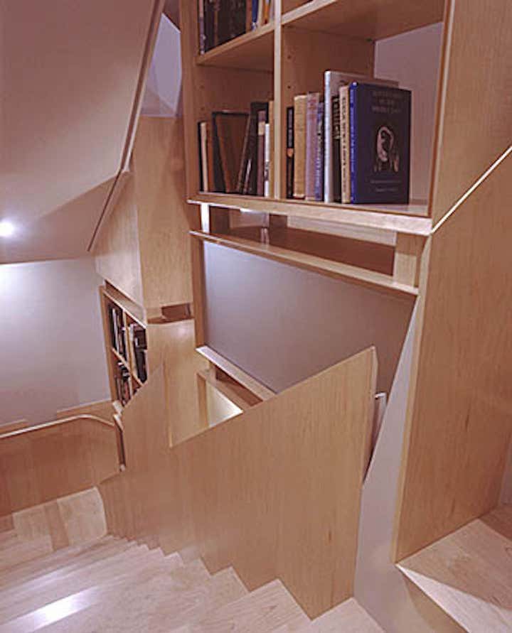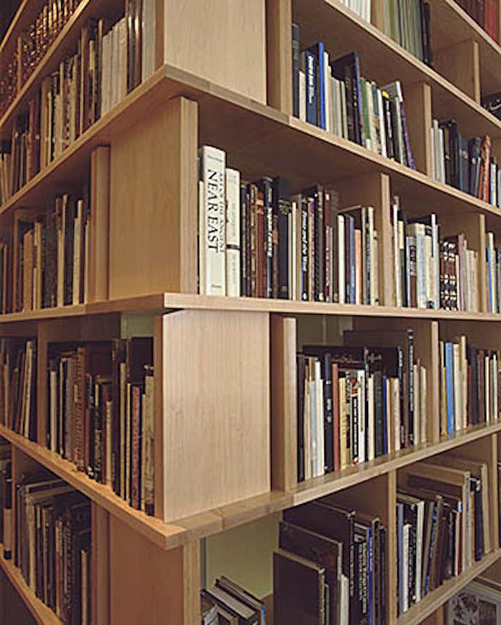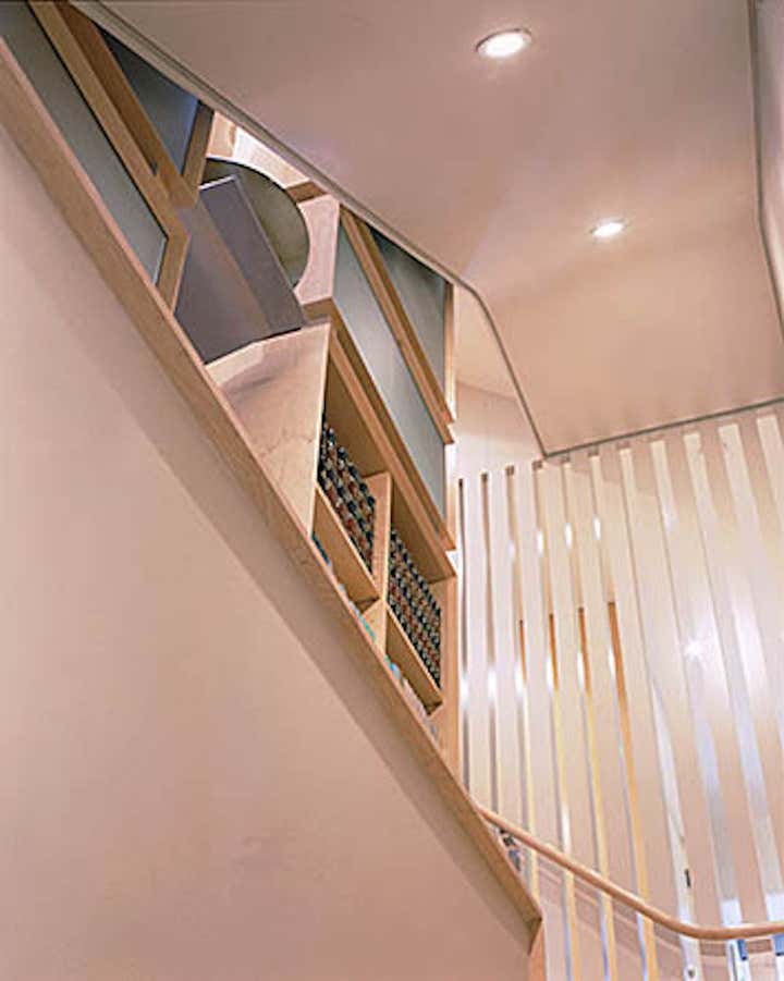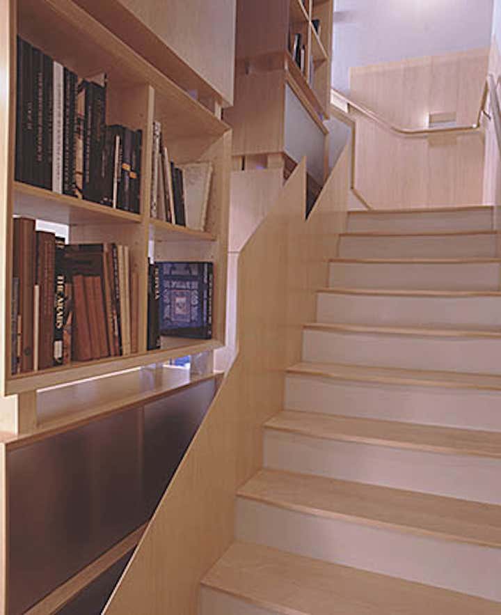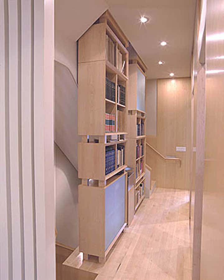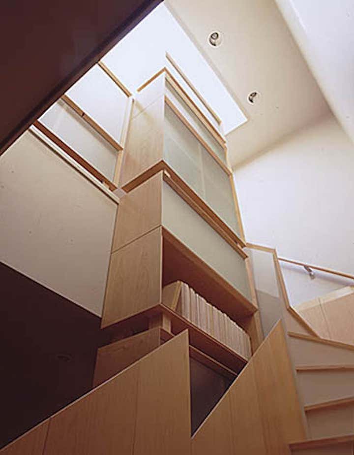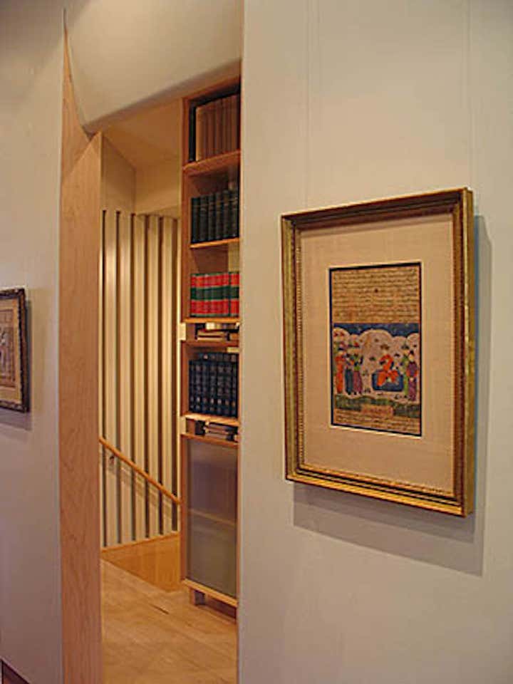 The project is a 6,300sf four-story row house interior renovation for a culinary artist and a rare book and art collector. The program includes a private residence and multiple rental units. The architecture of the private residence revolves around the need to display an extensive collection of Persian and Renaissance artwork, rare books and manuscripts. As a kind of library and small museum, the walls throughout the residence alternate between relatively taut and continuous surfaces for the display of artwork, to recessed and coffered millwork elements providing shelving spaces for books and art objects. A three-story bookcase tower extends from the second to fourth floor at the stairway core connecting the floors of the private residence and providing a type of viewing promenade throughout the space.