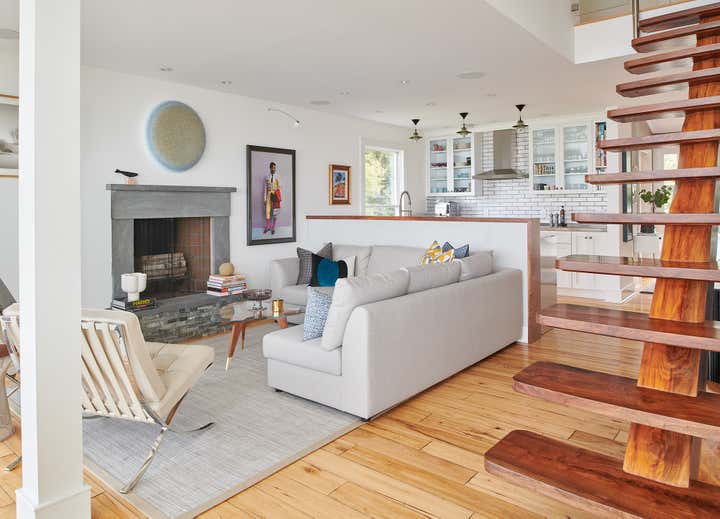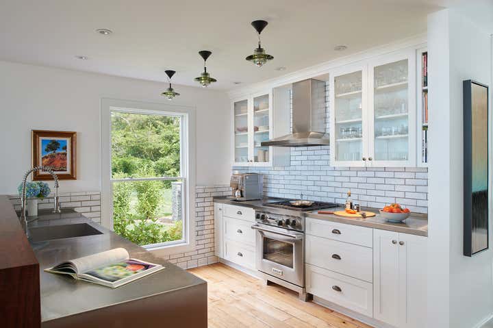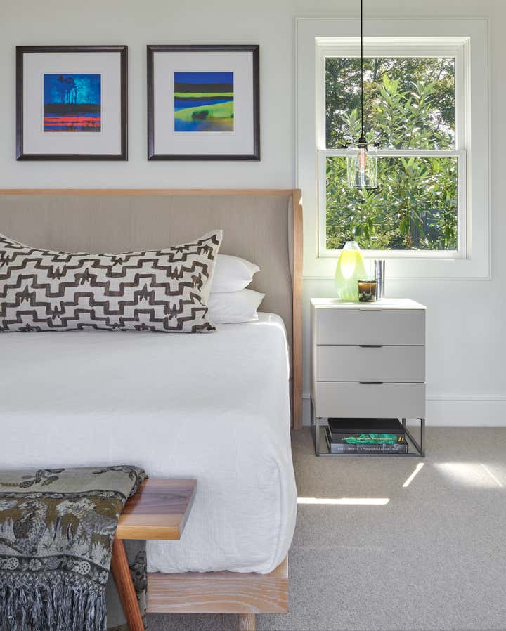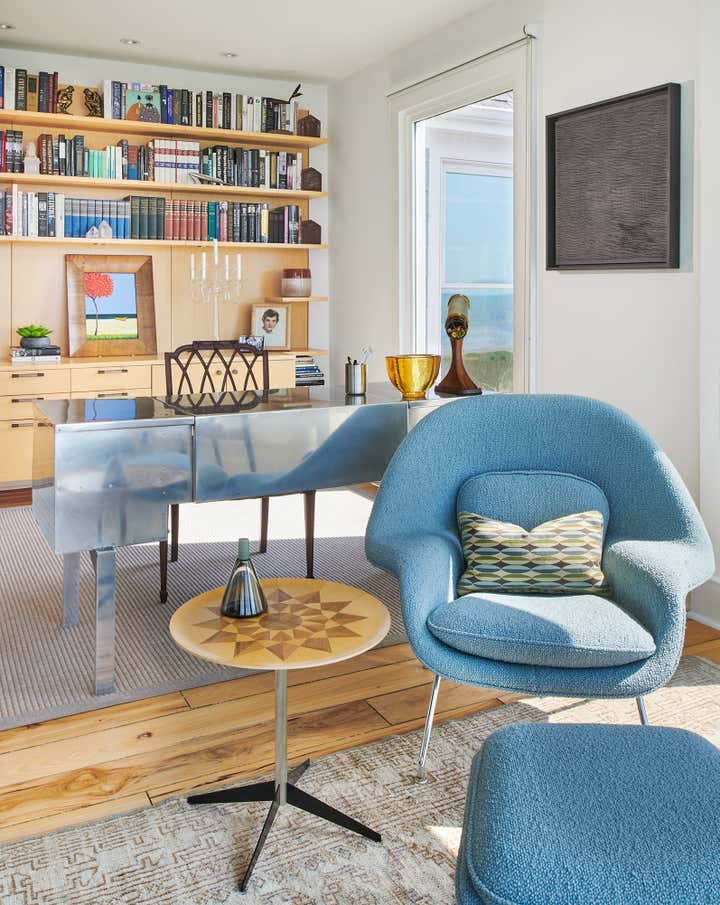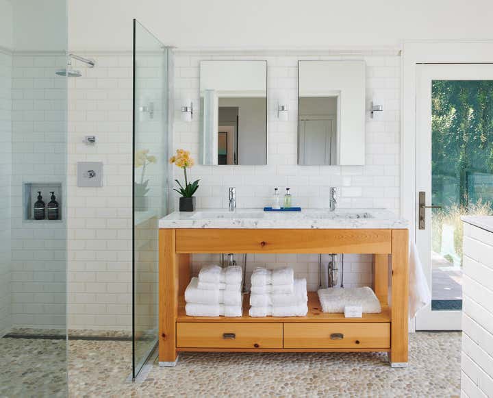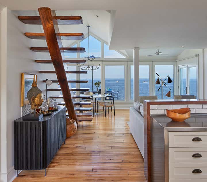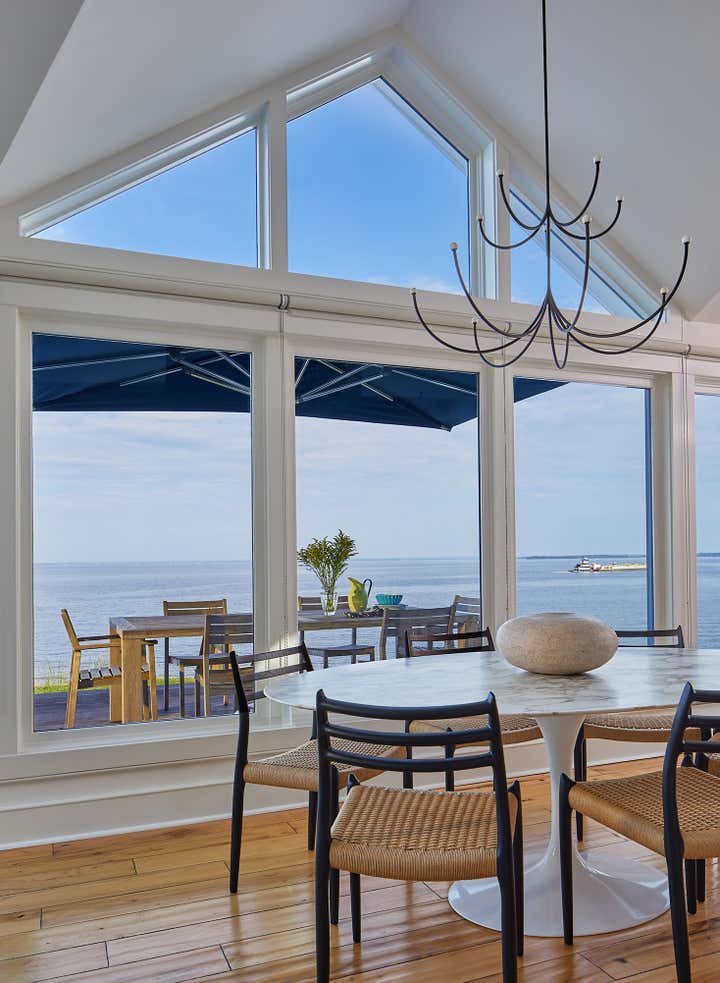 This Chesapeake Bay waterfront retreat was custom built for clients who travel and entertain. The home is filled with custom furniture, original art, and a unique blend of warm and cool materials. The guest house/office provide separate quarters and the pool and pergola design were overseen by Interior Matter as well. White walls allow the views of the Bay to be featured from nearly every room.
