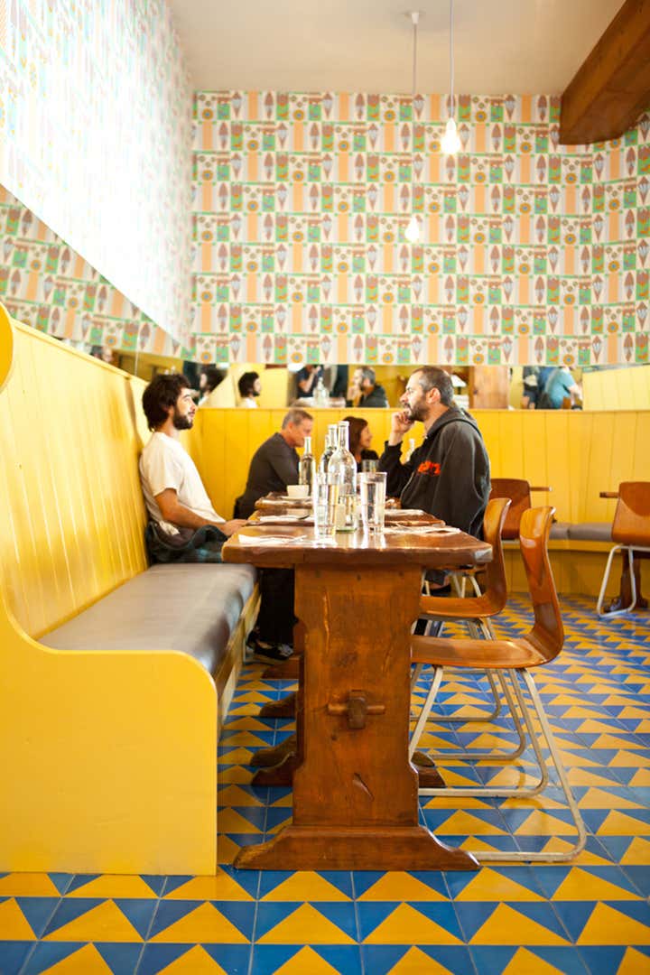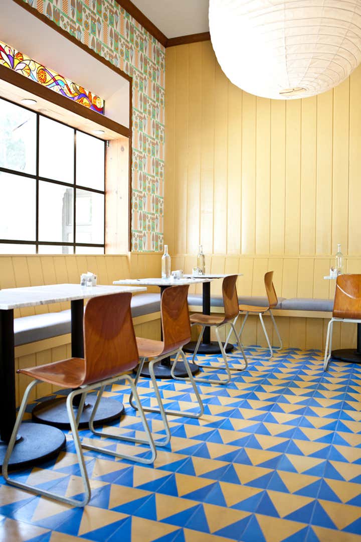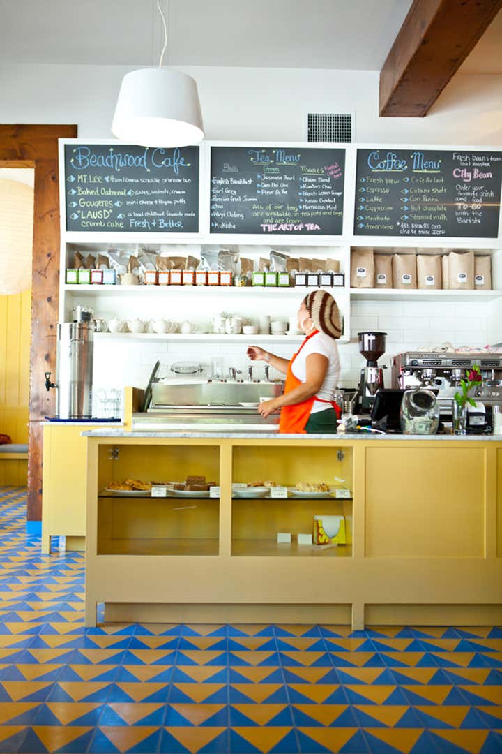 The Beachwood Café is a remodel of a somewhat decrepit but beloved local coffee shop in Beachwood Canyon, below the Hollywood sign. The new owner asked Bestor Architecture to re-invision the café interior- keeping some of the rusticated woodwork and trestle tables but making it much lighter and contemporary. We thought of the design concept as “Swedish girls who live in Tokyo come back to Sweden to take over their grandfather’s traditional restaurant in the country”. Graphic s, bright high contrast colors, new long benches based on the profile of the lder restaurants ‘dutch country’ style are all pieces of the strategy to reinvgorate yet keep ‘homey’ this local spot. As part of the neighborhood vibe we collaborated with local artists to incorporate psychedelic country wallpaper by Geoff McFetridge that is eerily similar to the fake toile wallpaper that used to define the older establishment.