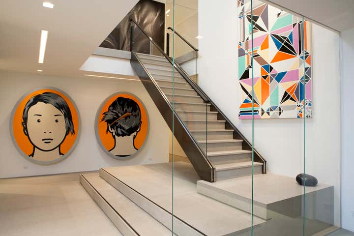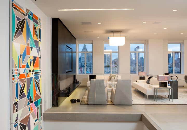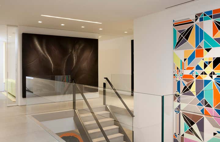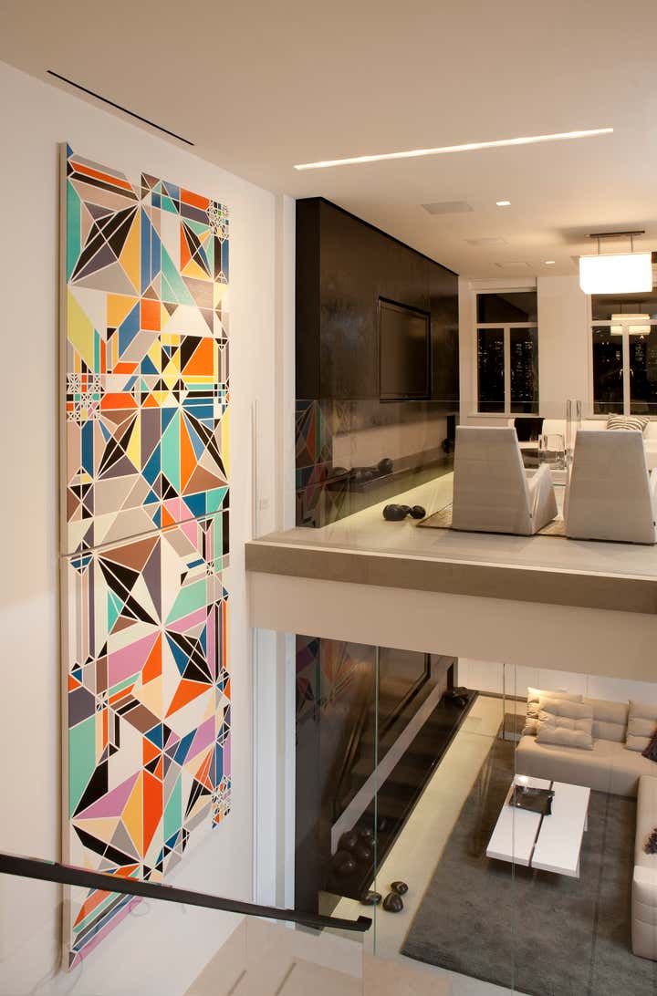 It took a purchase of 2 apartments to achieve the client’s goal of capturing the world-class views of the Central Park and the Museum of Natural History, framed in the windows of their duplex home. But the coveted apartment in this pre-war building was full of crown moldings and other period architectural details that weighed down the 5,000 sq.ft. of space. The objective was to create a voluminous space and the key to that was to take these 2 individual apartments back to the studs and start from scratch. After 4 schematic designs a final vision was created. Big, light-inhibiting walls came down, glass walls or sliders went up. Two 100 ft. long halls run the entire length of the home, doors disappear to welcome moving in and out of the rooms and bring maximum washes of natural light. A major architectural focal point is a magnificent, floating staircase built to join the floors. The top floor is comprised of all the public areas of the house as well as a generous kitchen and lounge, the lower floor houses grownups family room with a couch that comfortably seats up to 12 people, Master Bedroom Suite and all other bedrooms.