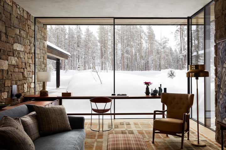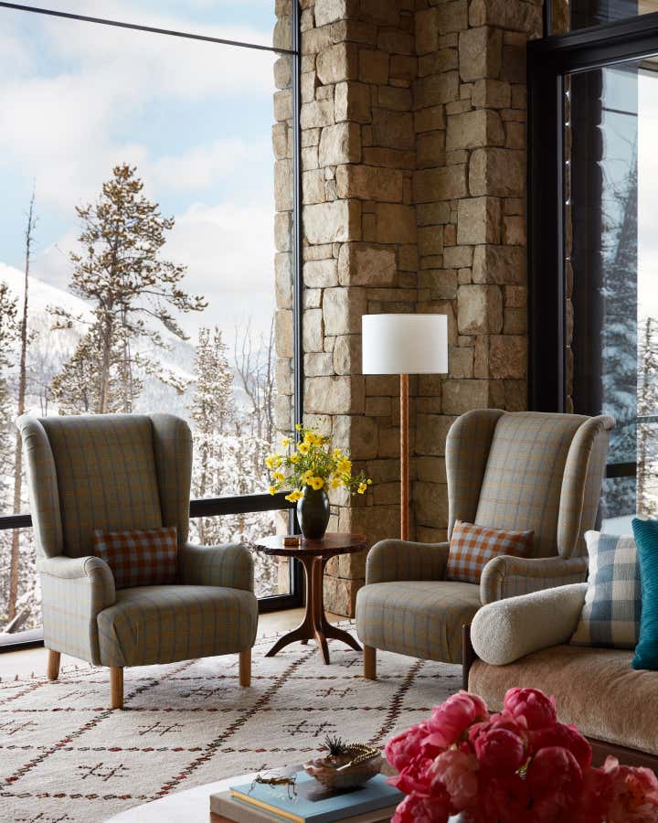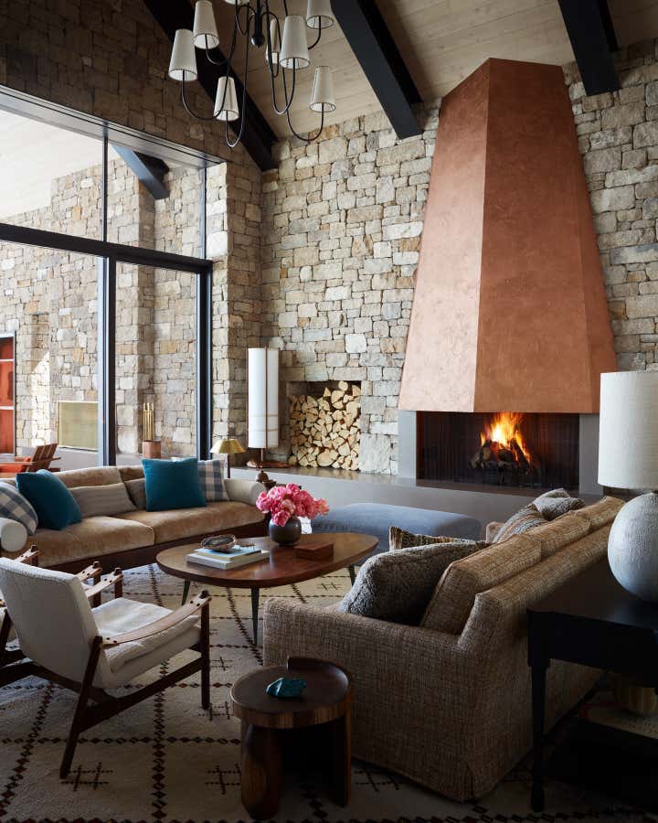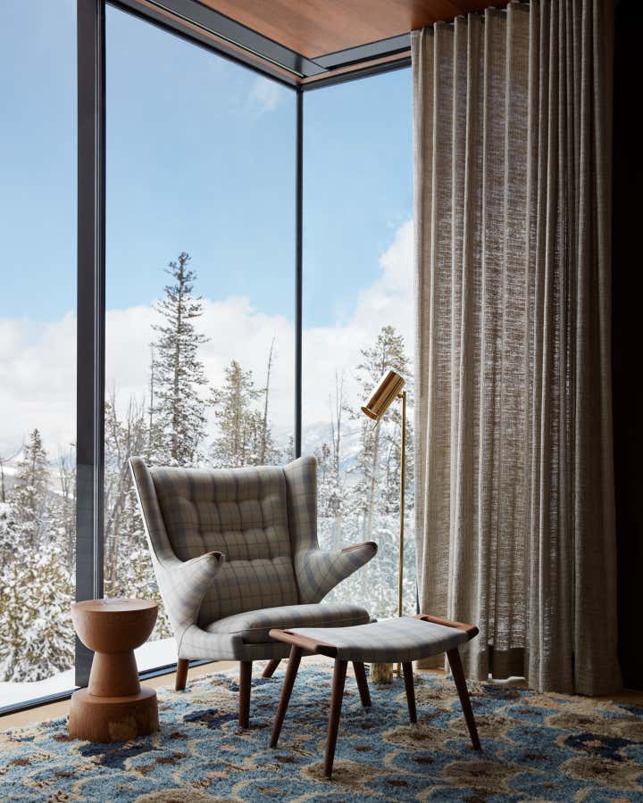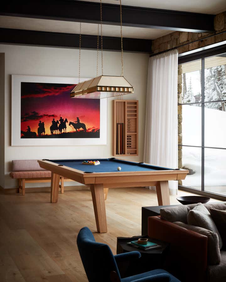 The 10,000 sq. foot, seven-bedroom house at the very top of Andesite Ridge in Big Sky Montana, was purchased by our client while it was under construction. They fell in love with the incredible views, but the plans in place didn’t reflect what the client wanted for their vacation home, so we were given a clean slate to completely redesign the interiors. They wanted the house to be highly functional, for family vacations with their four teenage sons, but also for it to feel refined and beautifully considered. We only kept in place several walls made from a local travertine and added natural oak floors, walnut millwork, Domingue plaster walls and ceilings, and bronze hardware by Van Cronenburg throughout.