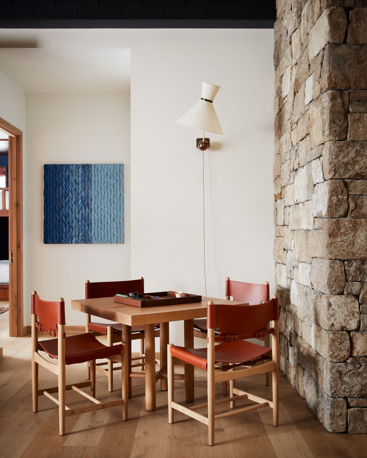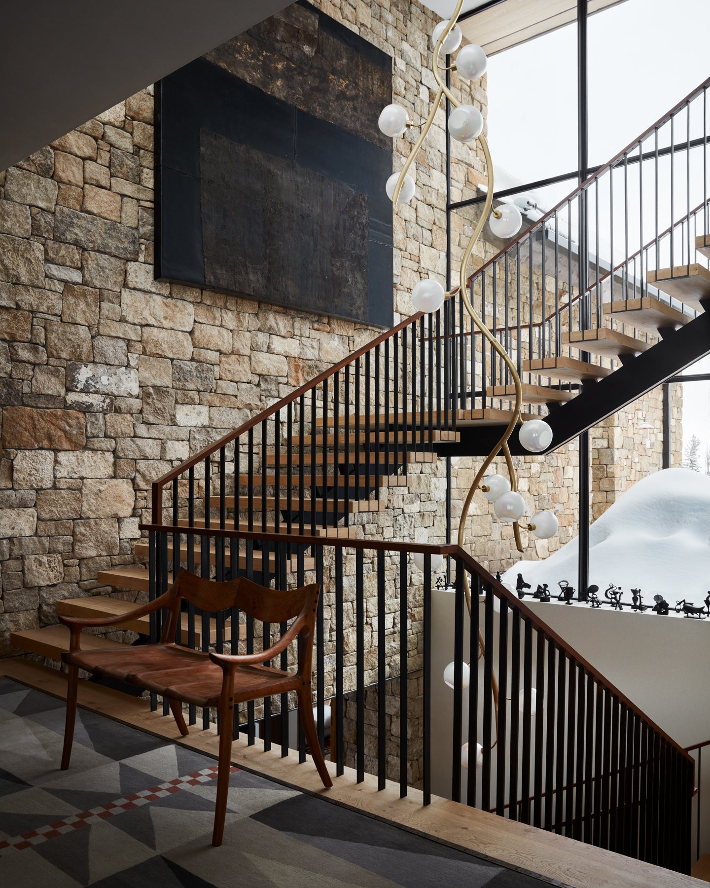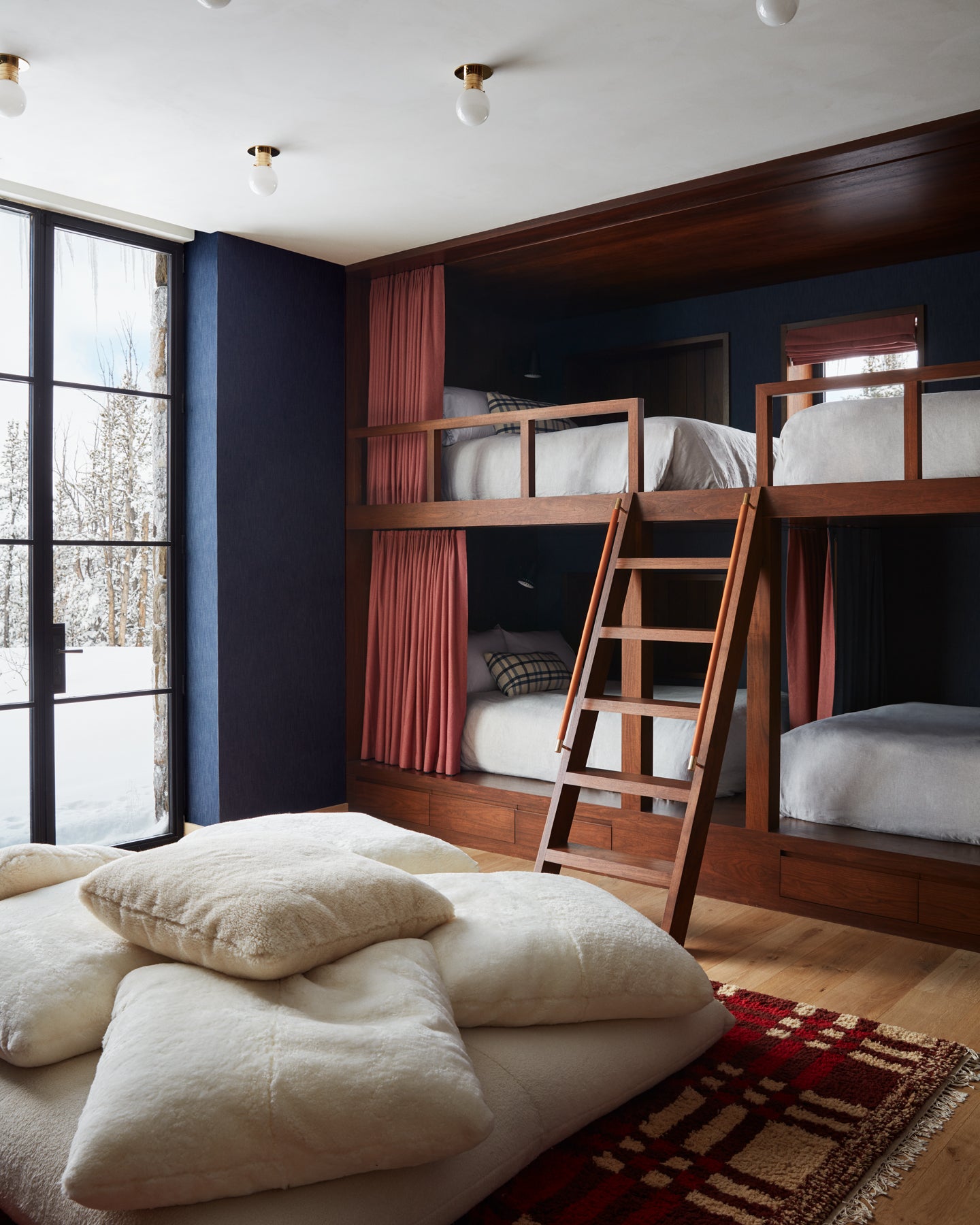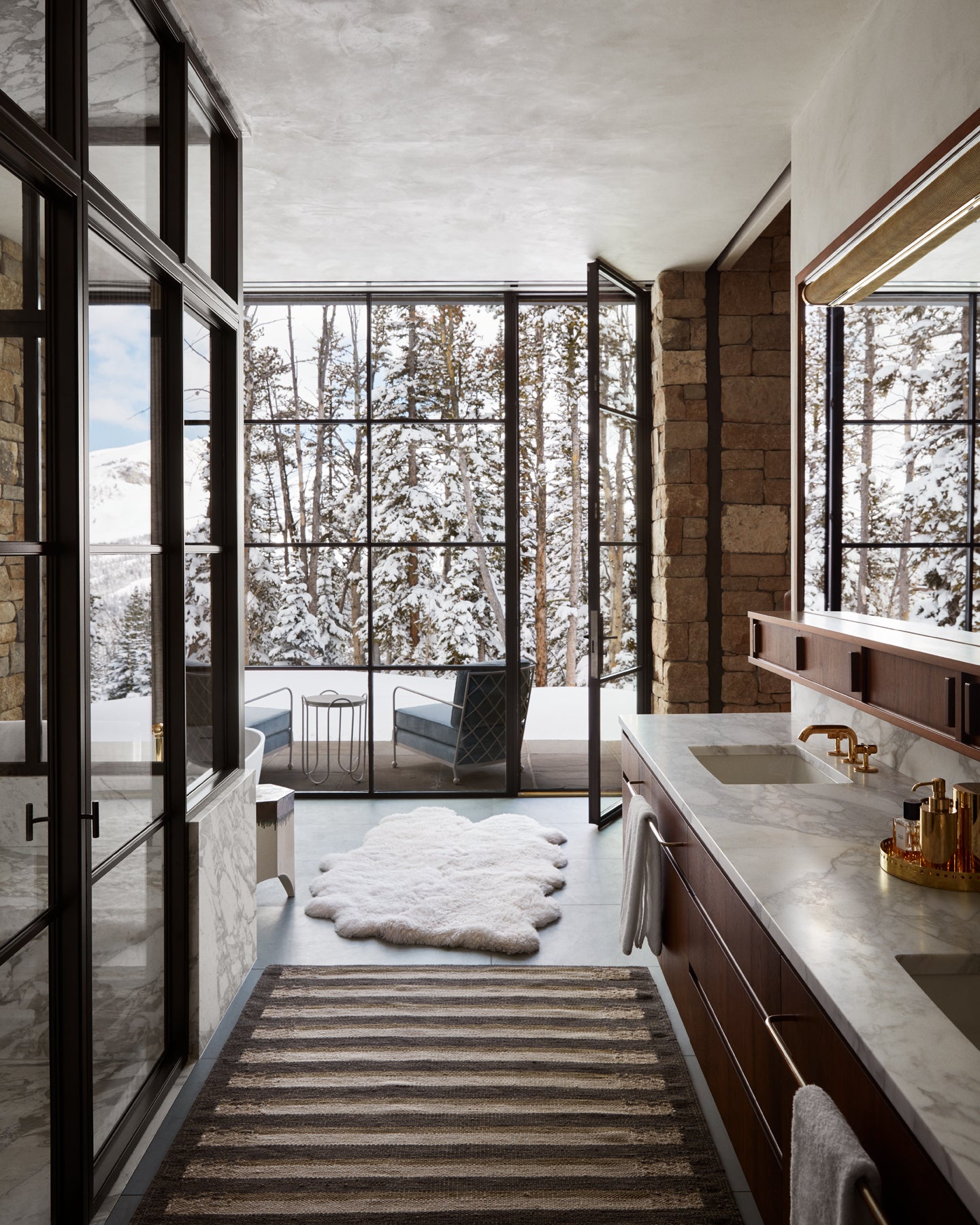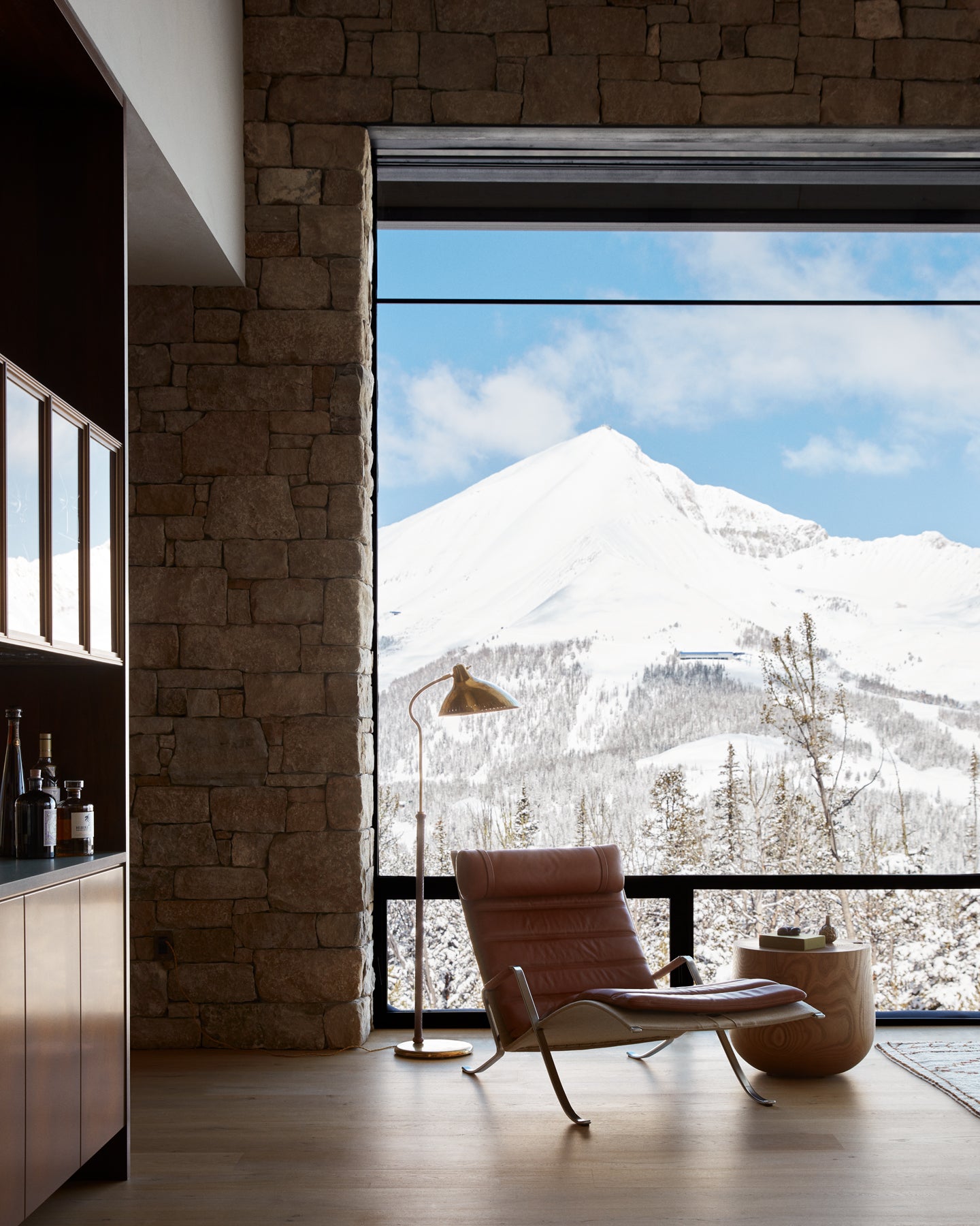 The 10,000 sq. foot, seven-bedroom house at the very top of Andesite Ridge in Big Sky Montana, was purchased by our client while it was under construction. They fell in love with the incredible views, but the plans in place didn’t reflect what the client wanted for their vacation home, so we were given a clean slate to completely redesign the interiors. They wanted the house to be highly functional, for family vacations with their four teenage sons, but also for it to feel refined and beautifully considered. We only kept in place several walls made from a local travertine and added natural oak floors, walnut millwork, Domingue plaster walls and ceilings, and bronze hardware by Van Cronenburg throughout.