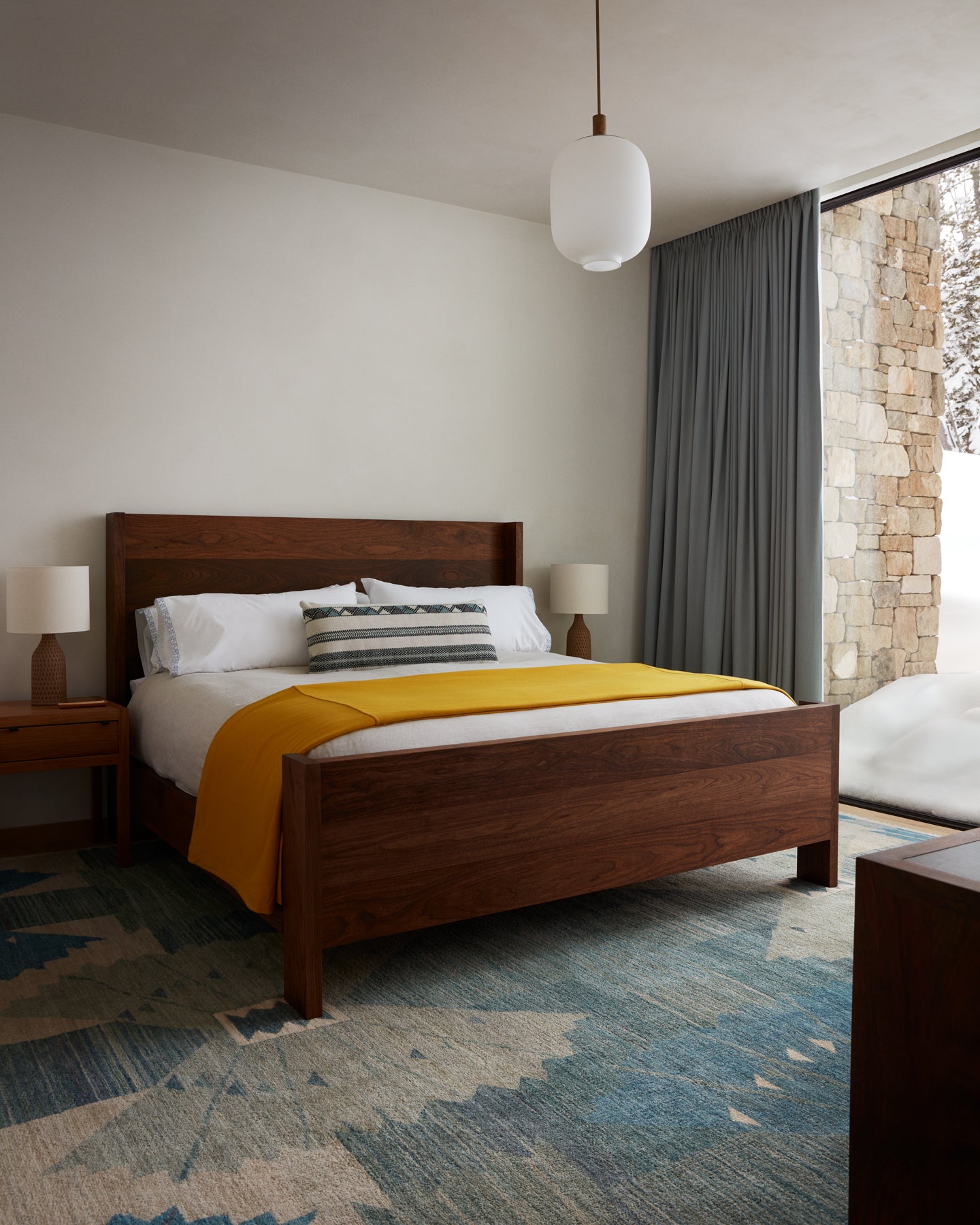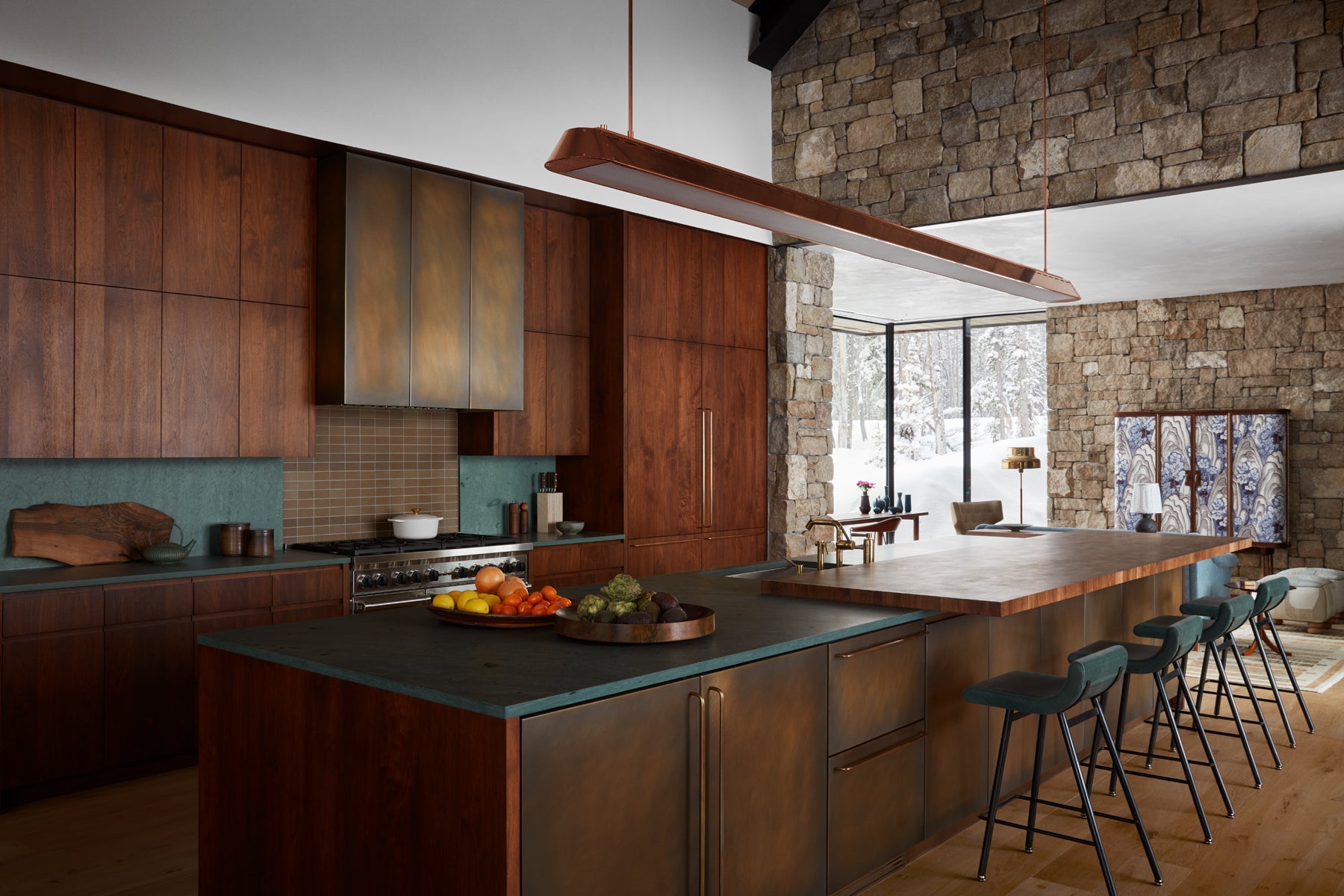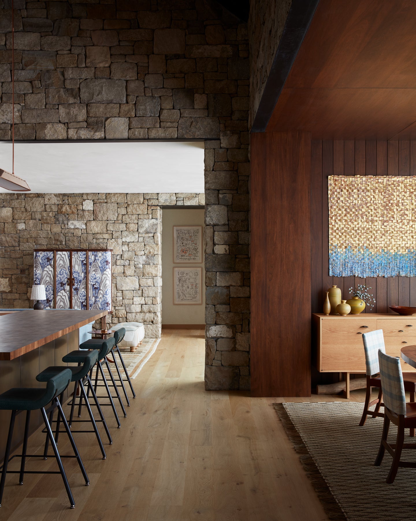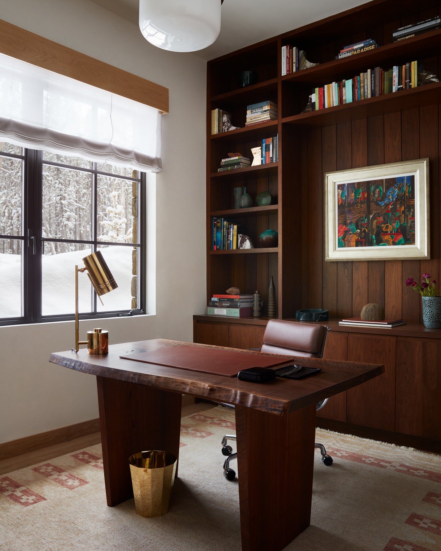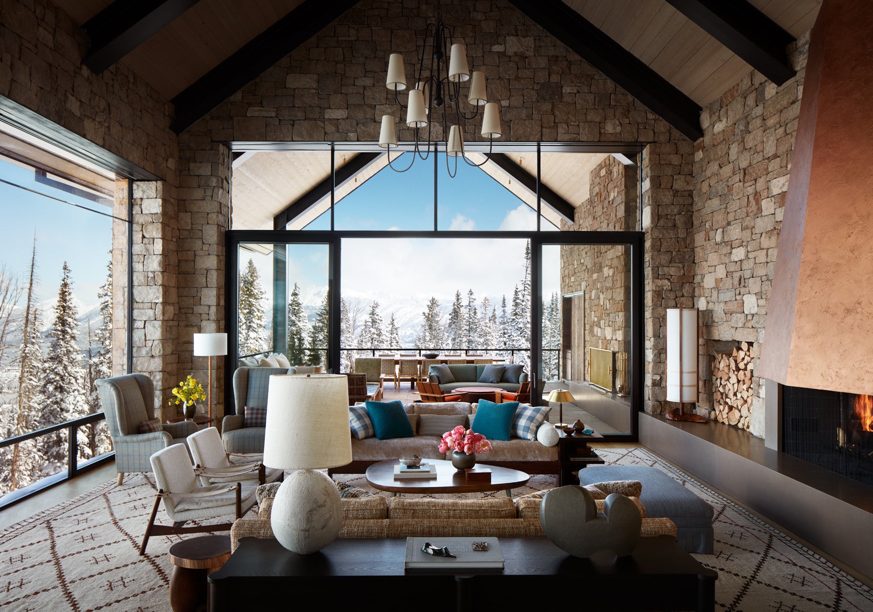 The 10,000 sq. foot, seven-bedroom house at the very top of Andesite Ridge in Big Sky Montana, was purchased by our client while it was under construction. They fell in love with the incredible views, but the plans in place didn’t reflect what the client wanted for their vacation home, so we were given a clean slate to completely redesign the interiors. They wanted the house to be highly functional, for family vacations with their four teenage sons, but also for it to feel refined and beautifully considered. We only kept in place several walls made from a local travertine and added natural oak floors, walnut millwork, Domingue plaster walls and ceilings, and bronze hardware by Van Cronenburg throughout.