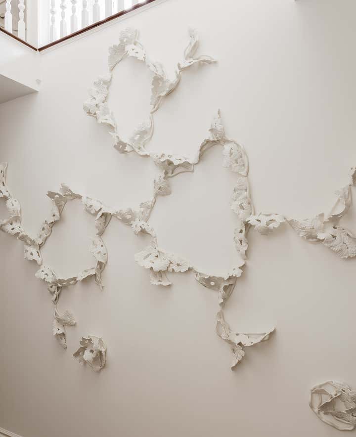 The staircase in this family home is highlighted by an Alice Riehl art piece.