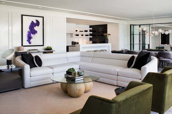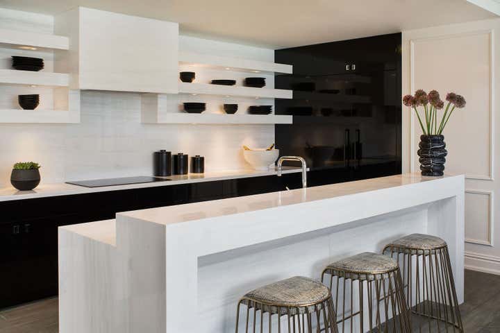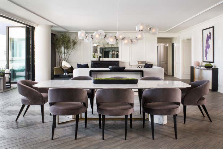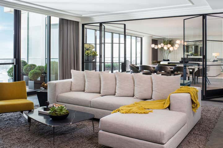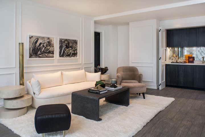 This luxury penthouse has a modern interpretation on era-specific and avant-garde refinement evoking an old-world aesthetic with a modern twist and hint of European flavor. The three-bedroom, five-bathroom home includes a separate retreat room in addition to a family gathering room across its 4,526 square feet. With a distinctive layout and charming design, this home exposes traditional elements, such as ornate wall moldings, Roman Doric columns, forged black iron glaze work and rustic herringbone parquet flooring. NanaWall windows roll back to invite an additional 820 square feet of outdoor living while ageless black iron bi-fold partitions divide conversational seating areas, the dining space and media room within. Entering through the grand living area allows you to take in the distinctive layout and intentional unique design. Entering through the grand living area allows your senses to take in the distinctive layout, intentionally designed to accommodate elegant living.