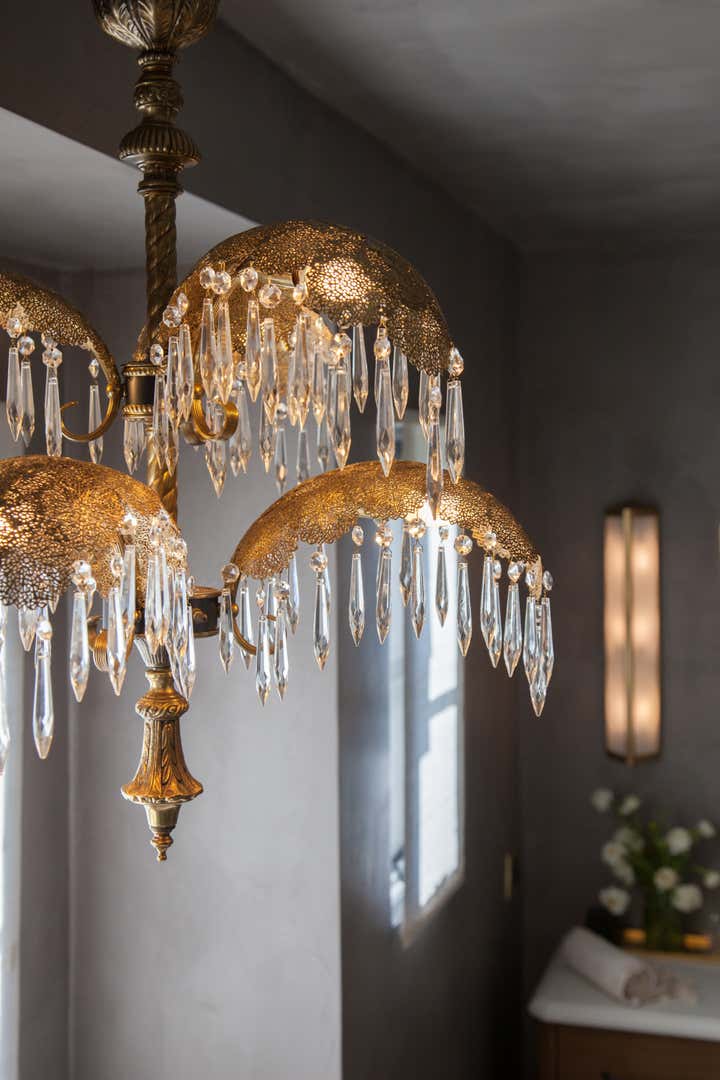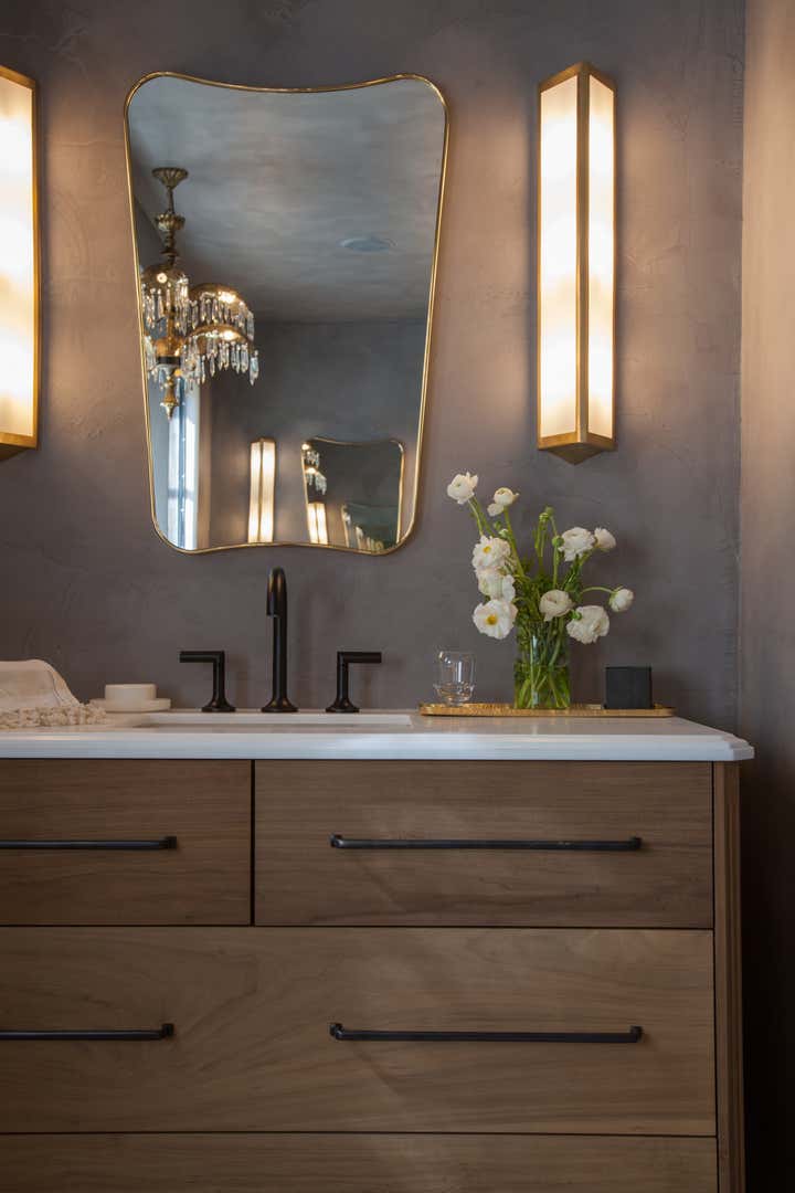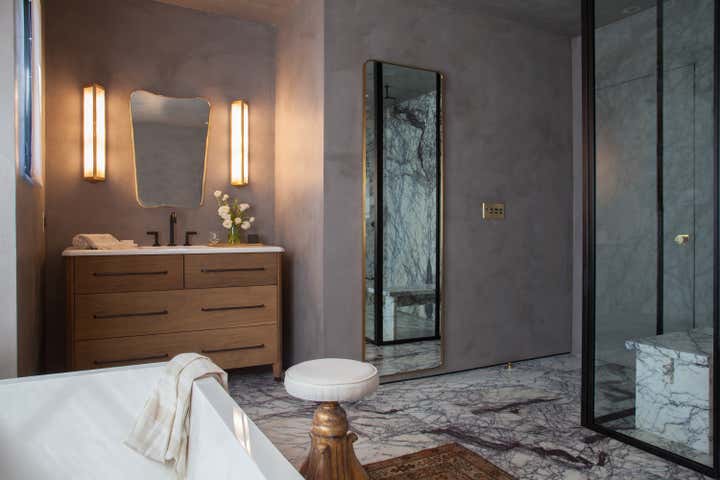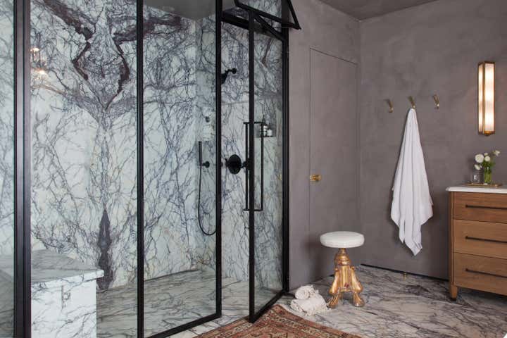 Working within the same layout we transformed this colonial style master bathroom into a luxurious space that blends historical and modern aesthetics. We wanted the finishes to feel special but not overpower the space. To achieve this, we ran lilac marble tiles along all the floors and then book-matched slabs in the same stone on the shower walls. To balance out this beautifully active marble we wrapped the walls in ceiling in a warm grey stucco giving a hint of texture and creating a completely wet room. Custom oak vanities in a neoclassical style flank a modern bathtub. Fine details such as push-button switching, flush doors and antique lighting and accessories elevate the luxurious atmosphere.