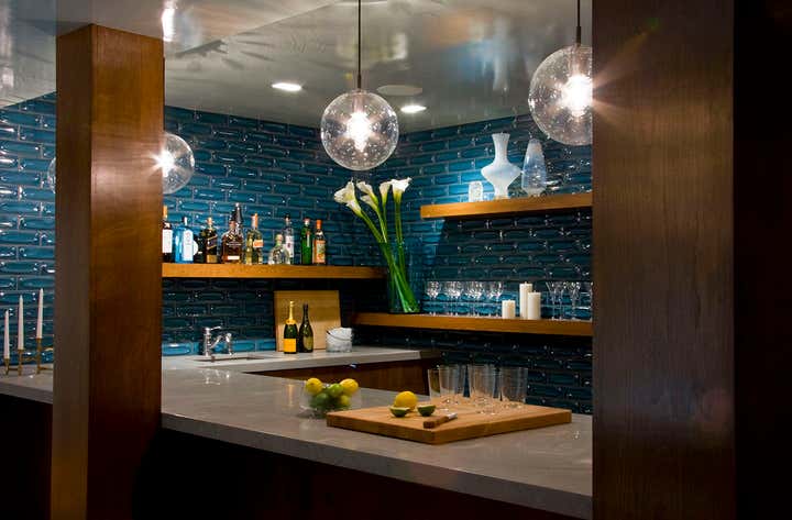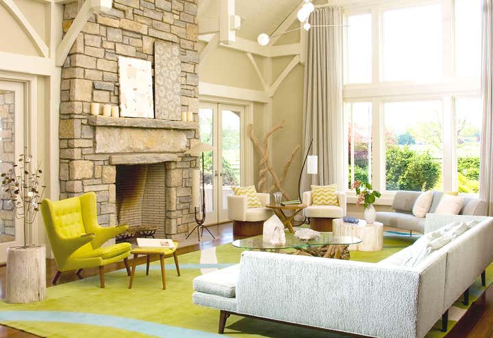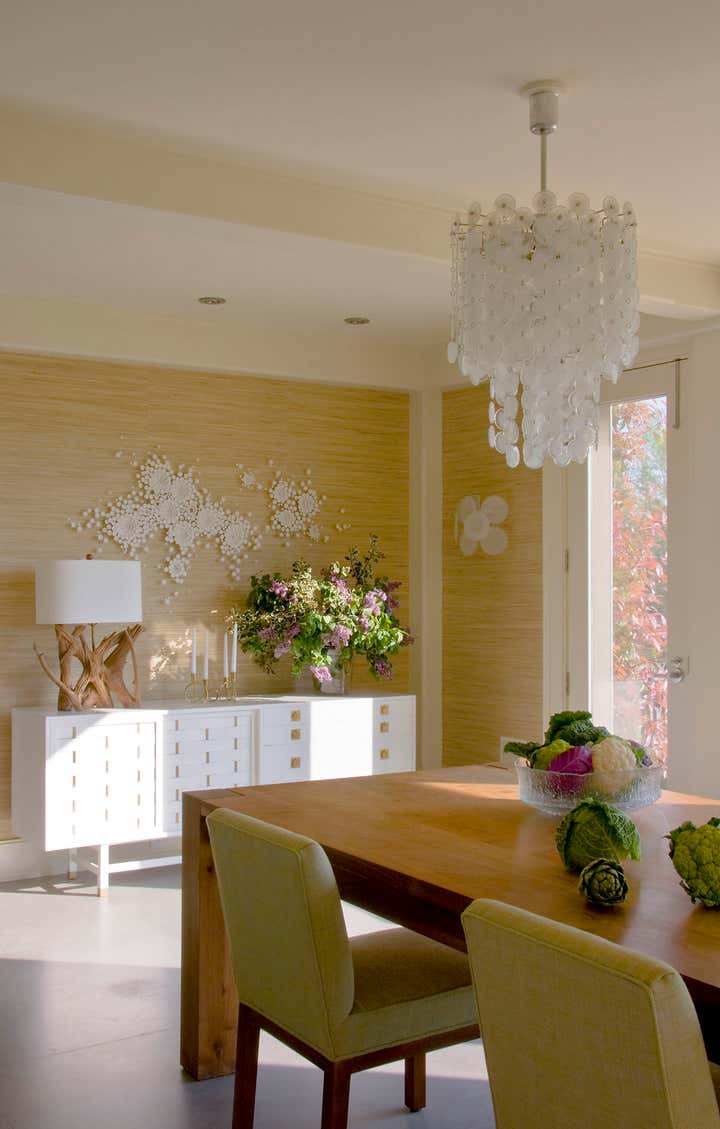 Inspiration for this lively and colorful beach house was found right where it was built - in the verdant nature of the Bridgehampton Polo Fields. In tune with its surroundings, the home celebrates the outdoors, bringing in the chartreuse green of the grass, and fresh touches of yellow and blue from the wild flowers visible from every room. Shades of green are experienced throughout the space, with the custom living room rug becoming an extension of the polo fields outside. Playful elements reflecting the nearby beach, such as a Murano glass chandelier and Vistosi sconces that resemble iridescent shells, complete the light filled space.