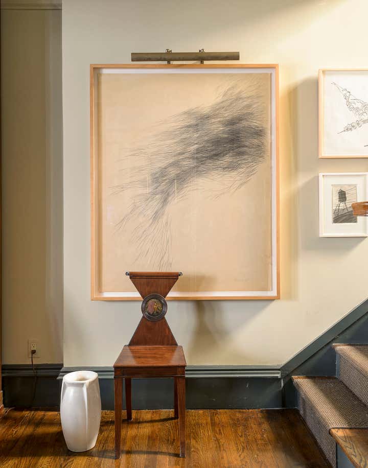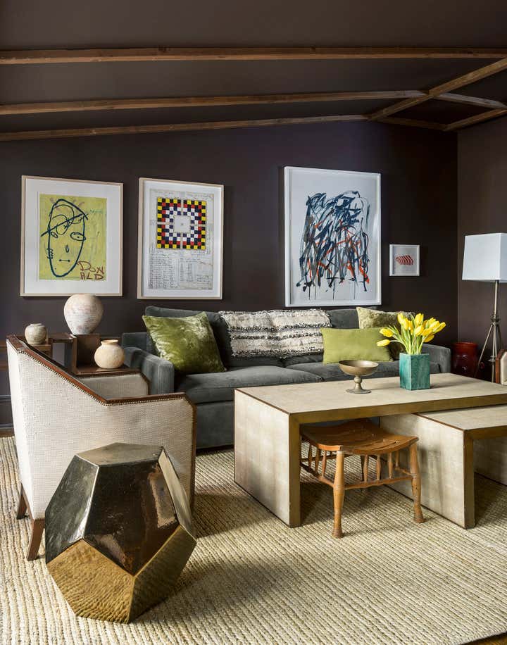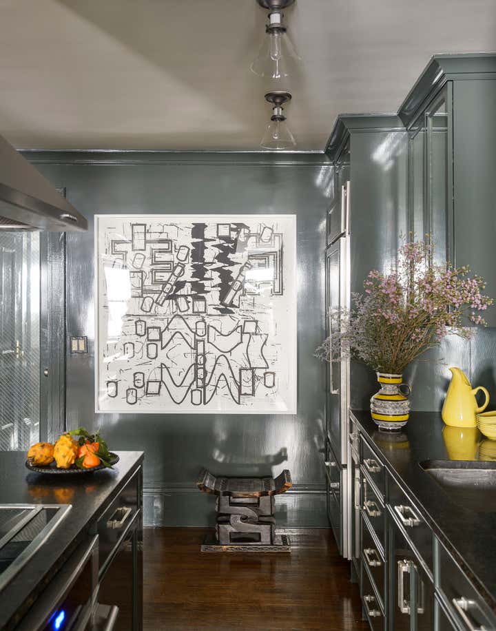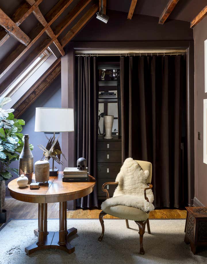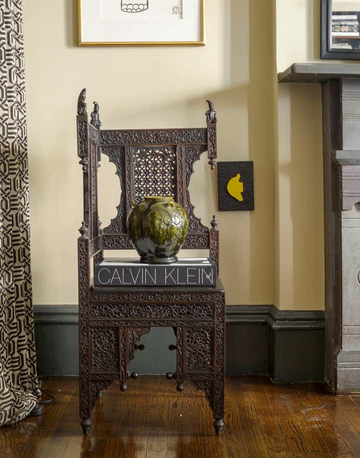This brownstone duplex – Glenn Gissler’s own — in the heart of historic Brooklyn Heights, represents a fine distillation of the designer’s development over the past three decades. The tailored, masculine sensibility of these rooms is expressed through unabashedly dark colors–camel, chocolate brown, and green-black–which create a subdued yet rich background for Glenn’s collection of art, furniture and objects, grouped in tableaux which he regularly rearranges. As a collector of Arts & Crafts and Aesthetic Movement furniture, both American and British, he free reign in this apartment to incorporate seminal examples of such design. Thus a Liberty & Co. “Thebes” stool has pride of place beside a very contemporary settee, upholstered in a chocolate and cinnamon woven stripe. Christopher Dresser ceramics, contemporary drawings and other works on paper, including distinctive “outsider art” harmonize with curtains patterned like African fabric and a rich selection of natural yet polished materials–dark green granite, exotic hardwoods, and burnished metals.