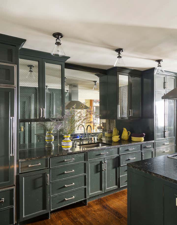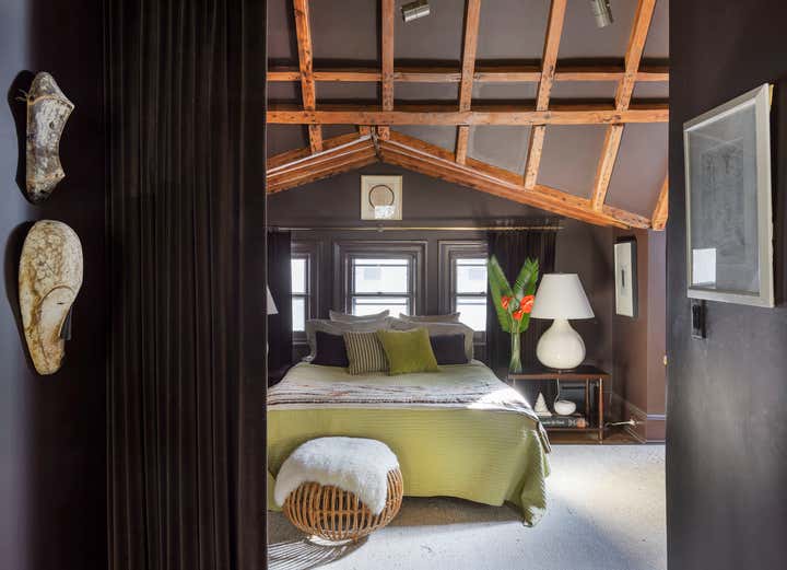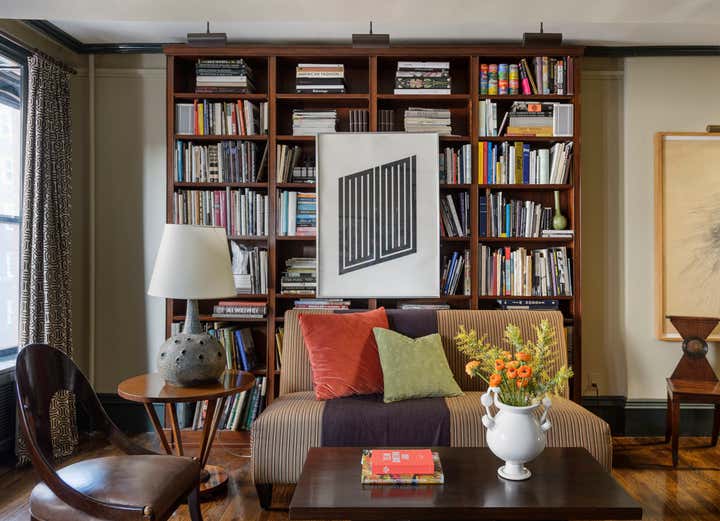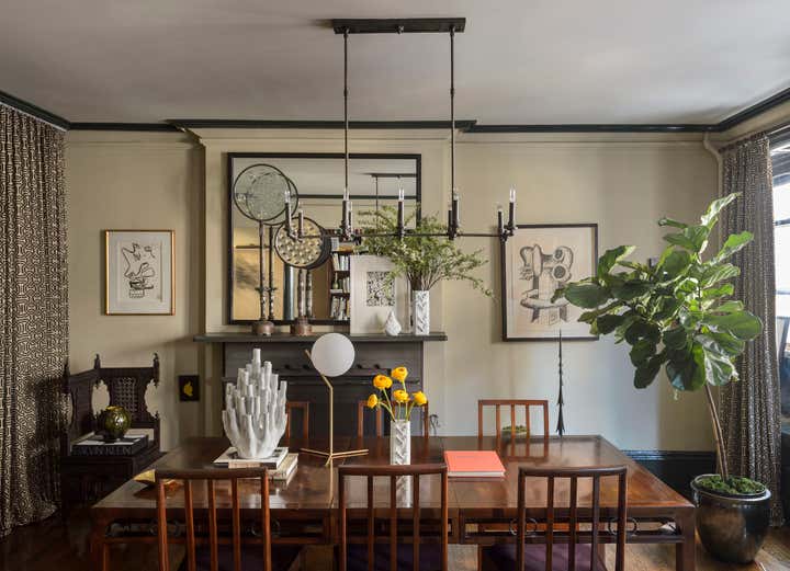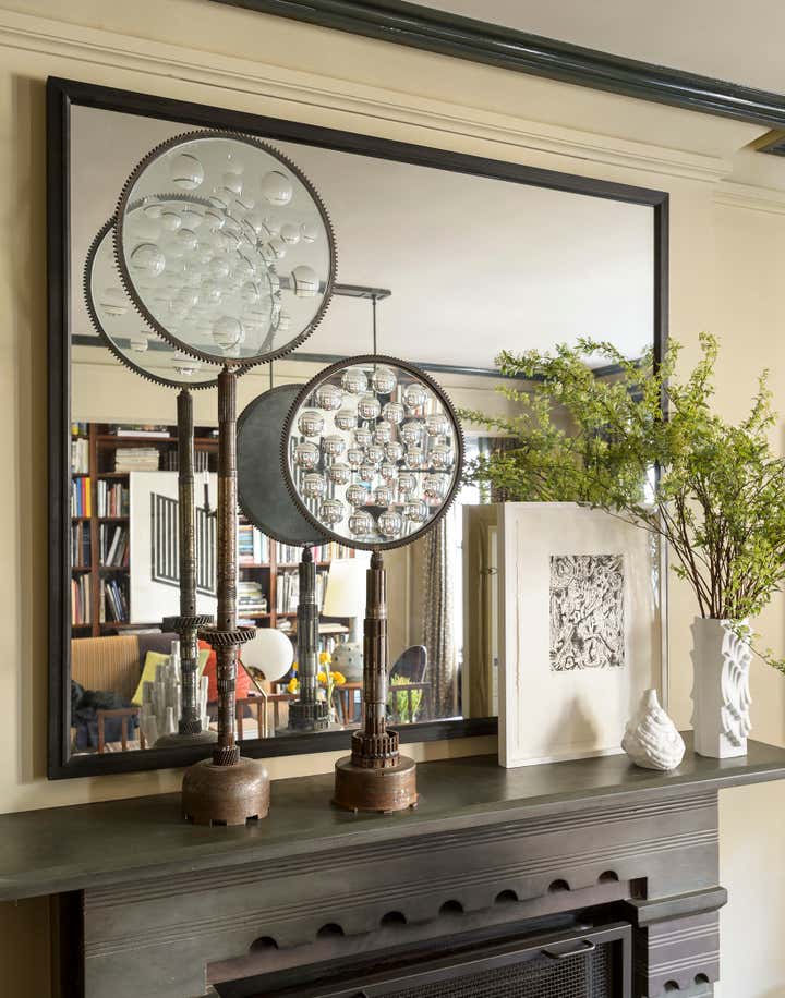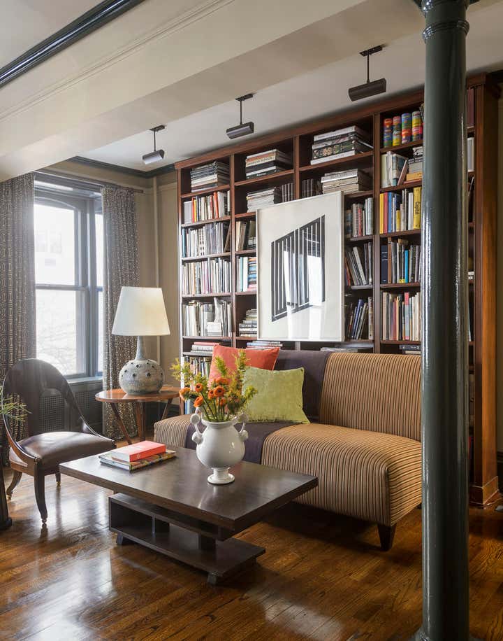 This brownstone duplex – Glenn Gissler’s own — in the heart of historic Brooklyn Heights, represents a fine distillation of the designer’s development over the past three decades. The tailored, masculine sensibility of these rooms is expressed through unabashedly dark colors–camel, chocolate brown, and green-black–which create a subdued yet rich background for Glenn’s collection of art, furniture and objects, grouped in tableaux which he regularly rearranges. As a collector of Arts & Crafts and Aesthetic Movement furniture, both American and British, he free reign in this apartment to incorporate seminal examples of such design. Thus a Liberty & Co. “Thebes” stool has pride of place beside a very contemporary settee, upholstered in a chocolate and cinnamon woven stripe. Christopher Dresser ceramics, contemporary drawings and other works on paper, including distinctive “outsider art” harmonize with curtains patterned like African fabric and a rich selection of natural yet polished materials–dark green granite, exotic hardwoods, and burnished metals.