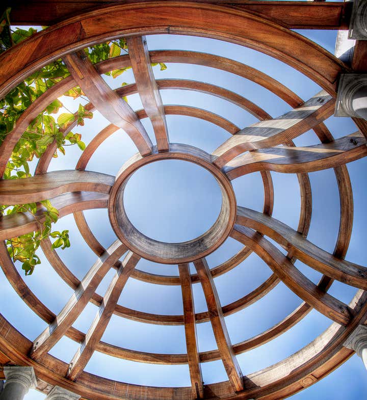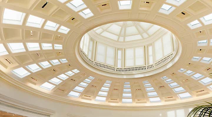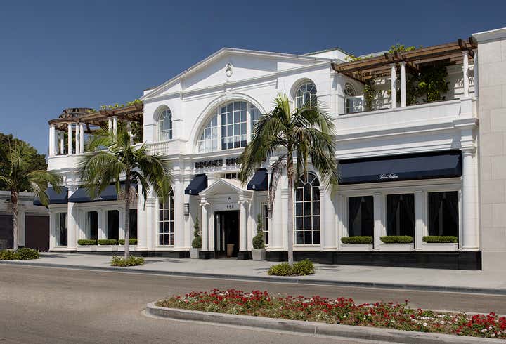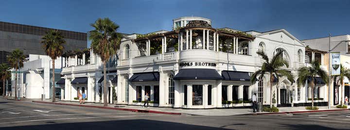 The exterior design emphasizes the entrances on Rodeo Drive and Little Santa Monica Boulevard. The terraces, canopies of vines, large areas of glass, and modulated architecture distinguish this building from its neighbors on Rodeo Drive. The airy and open interior develops around the two-story center space with its glass dome and staircase.