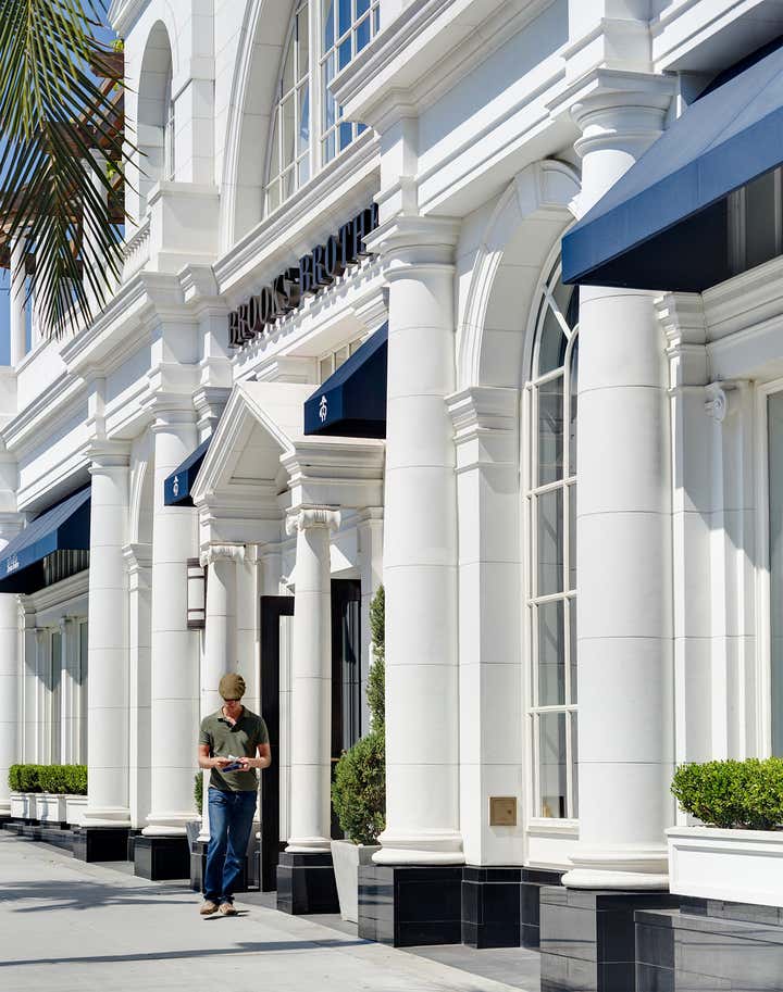 Sited at the entrance to Rodeo Drive’s famed shopping district, this new building was designed to relate to adjacent buildings, particularly the Museum of Television and Radio and the Polo store, and to take advantage of Los Angeles’s marvelous year-round climate through its exterior balconies covered with flowering vines.