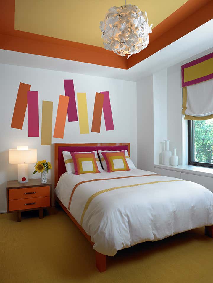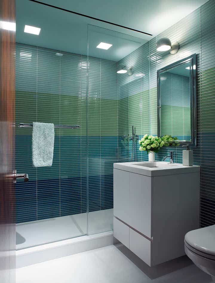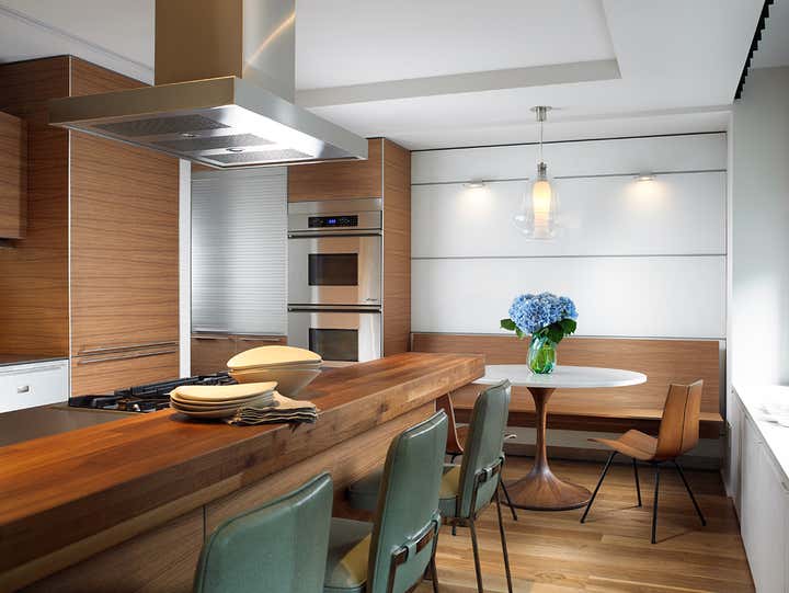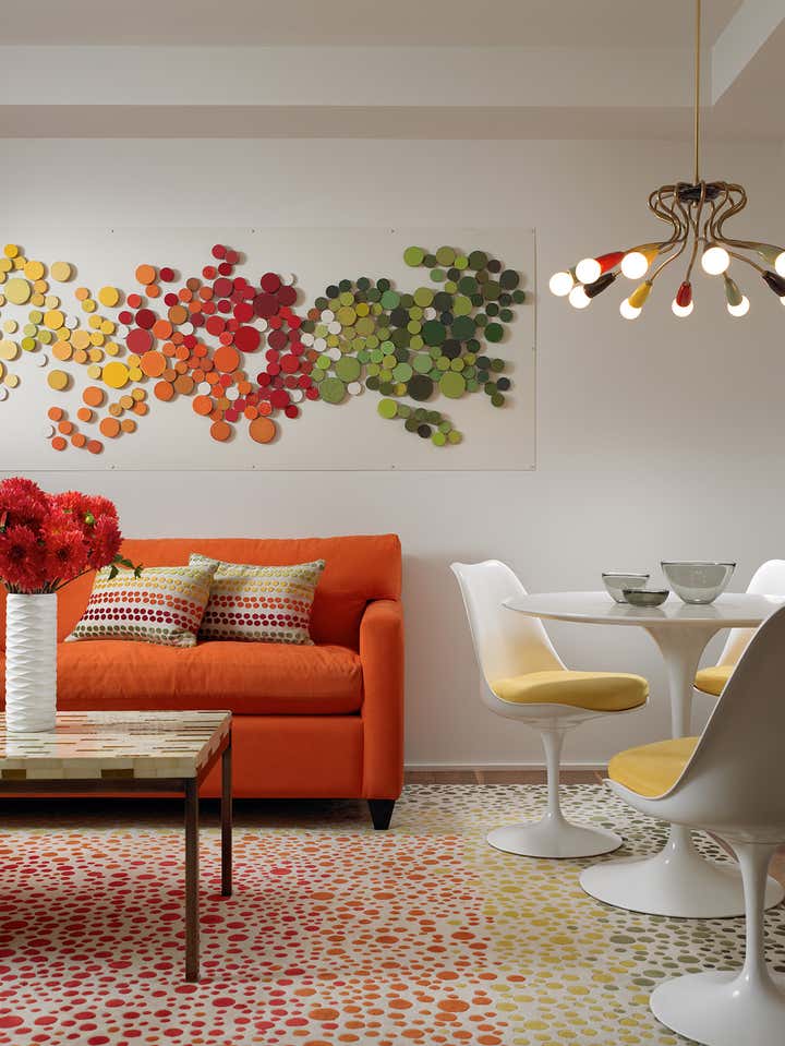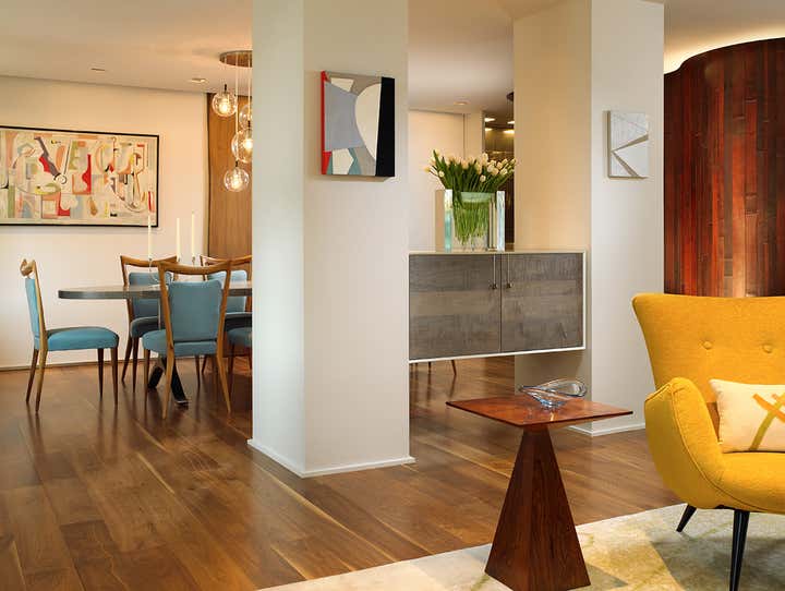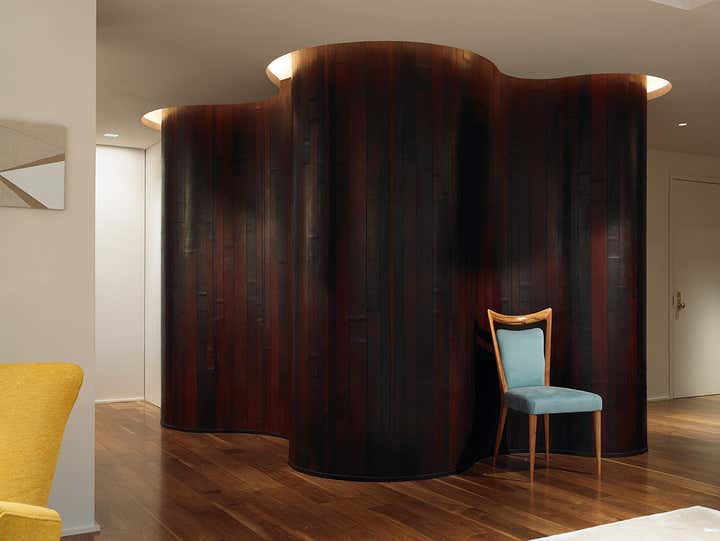 This L-shaped apartment, with a monolithic column dominating the hall opposite the entry, meant there was no natural flow from one room to another. The wavy outline of Alvar Aalto’s iconic Savoy vase provided inspiration for the solution. We devised an undulating wall, which wraps itself around the column to gracefully divert incoming guests away from the kitchen and into the living room and dining room beyond. Sculptor and furniture designer, Jim Zivic, was commissioned to clad the structure’s facade with strips of chocolate-brown leather. For the living room rug, we selected a Fort Street Studio watercolor to use as inspiration, then customized the colors and manipulated its concentric circle to make it radiate outward so that its translation into a rug would pull together the seating area.