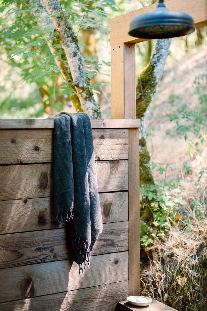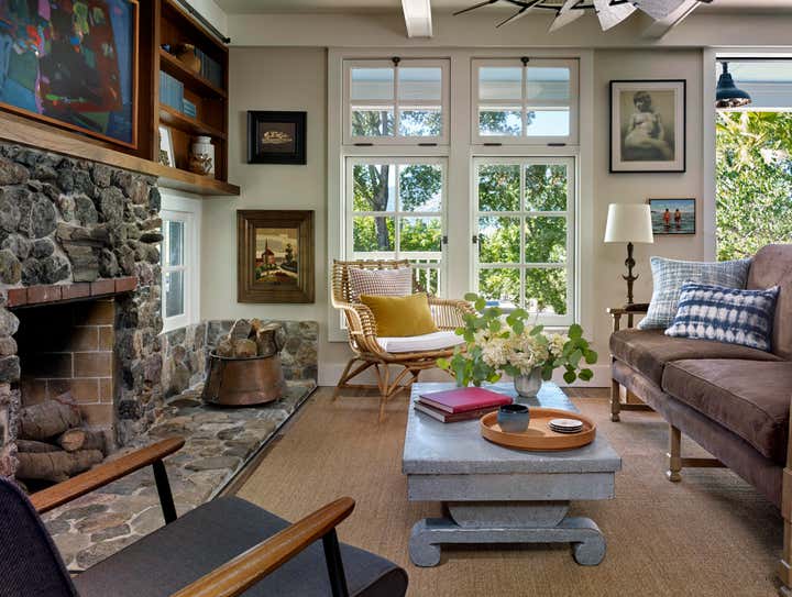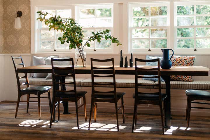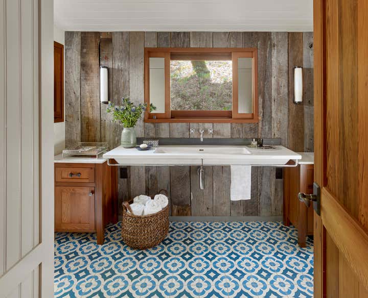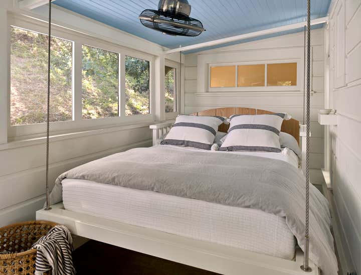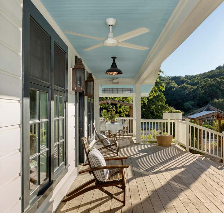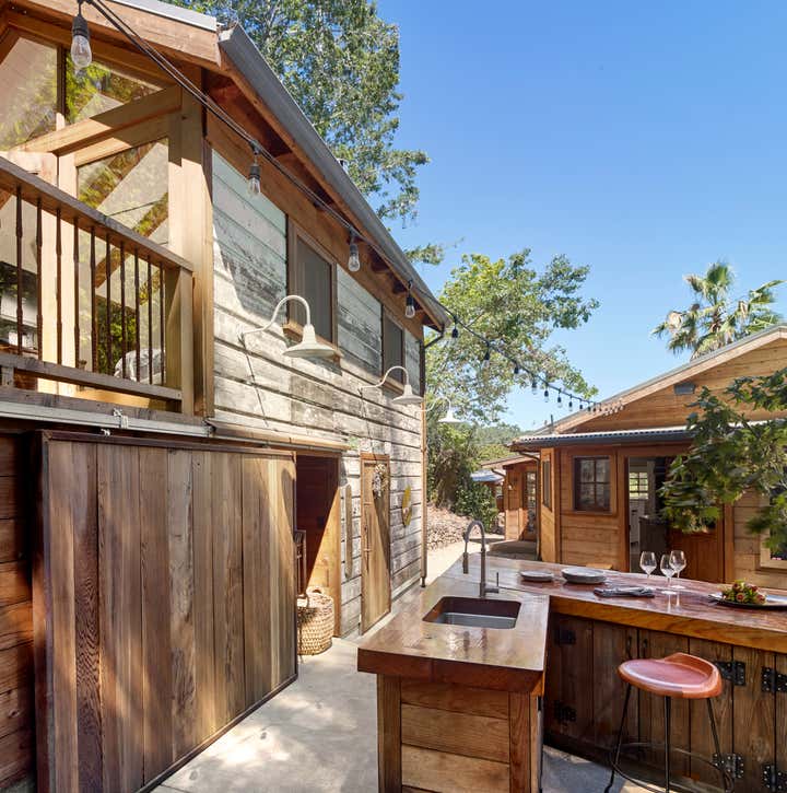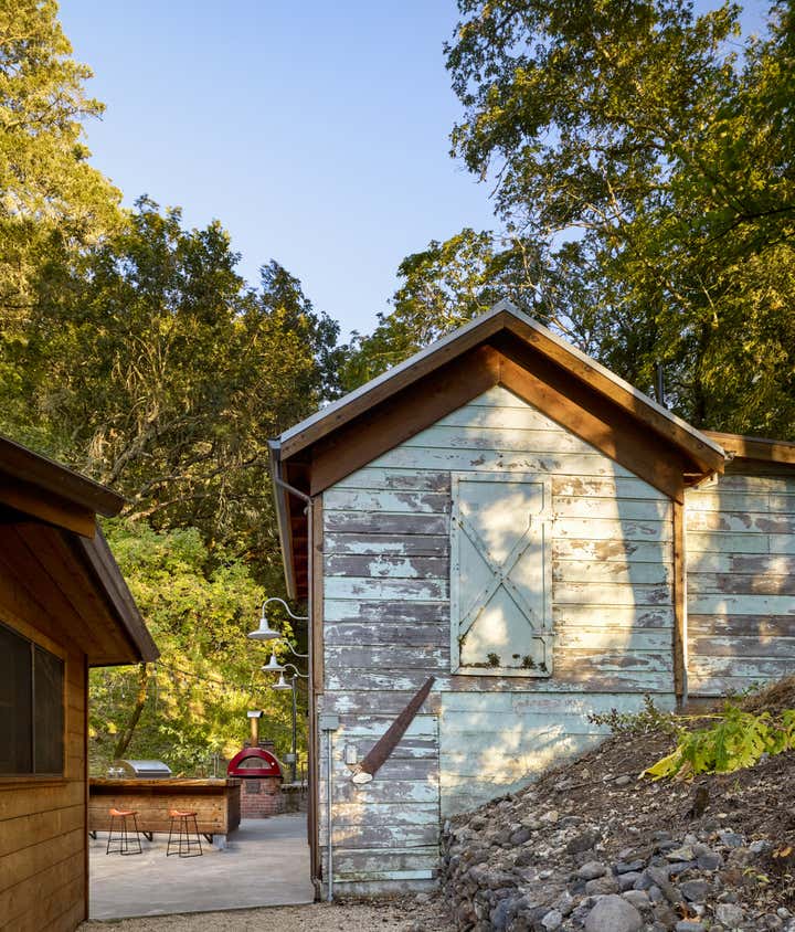 After owning this property for several years, the client, a busy, successful chef and restaurateur, was finally ready to take on a proper remodel of both the main house and a historic shed, formerly owned by a surviving member of the Donner family, of the eponymous ill-fated wagon train. JKA began with the shed, converting it to a master suite cottage, with a wine cellar and laundry below. In the main home, all trim and floors were replaced, box beam ceilings added, and an expansive, open kitchen with a large island was built. Portions of a wide, wraparound porch were repurposed as a second guest room on one side -- a charming screened-in "sleeping porch" -- and a formal dining room on the other side of the home, close to the kitchen. A pair of mirror panels above the cottage bath retract into pockets, revealing a window with a view onto the hillside -- and just outside the door of the cottage bath is a discreet outdoor shower. The furnishings evoke the casual aesthetic of California style and mix contemporary and rustic elements -- cultivating an atmosphere ideal for relaxation, rejuvenation, good food, and cocktails.