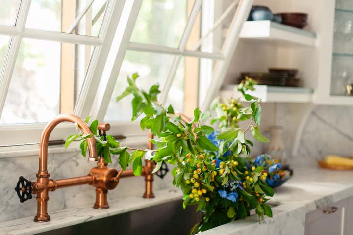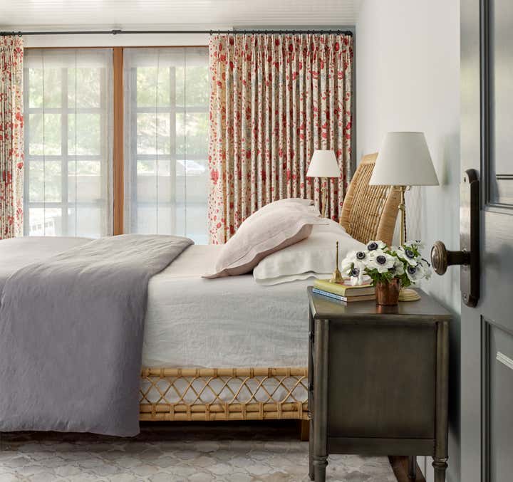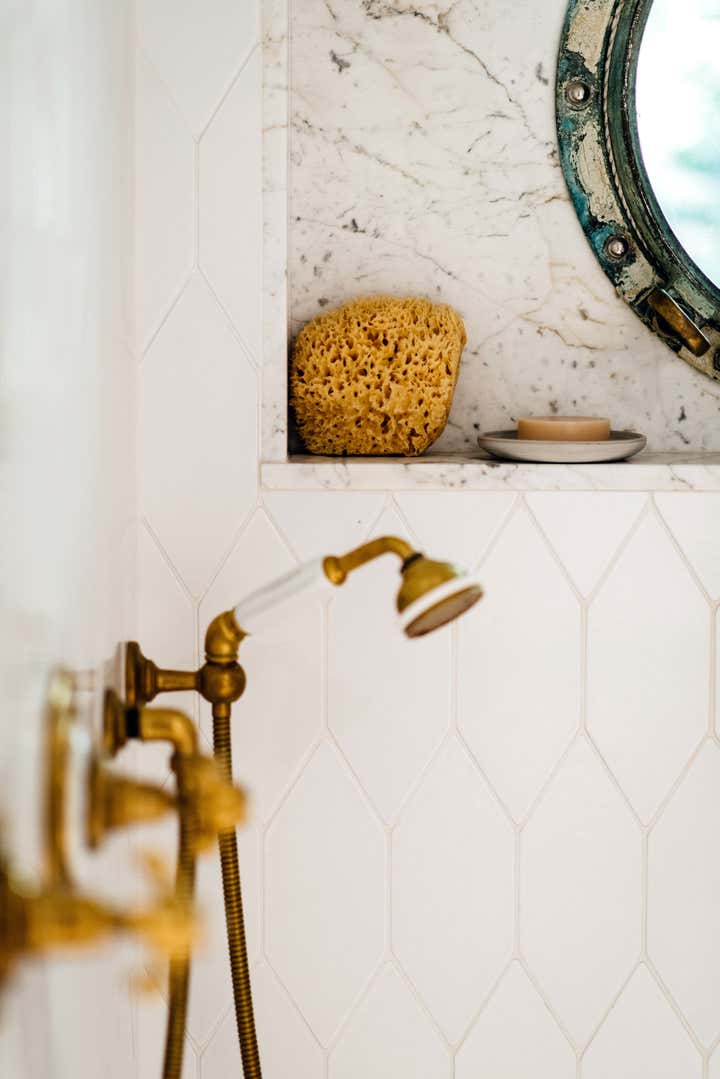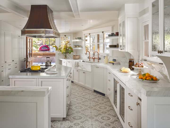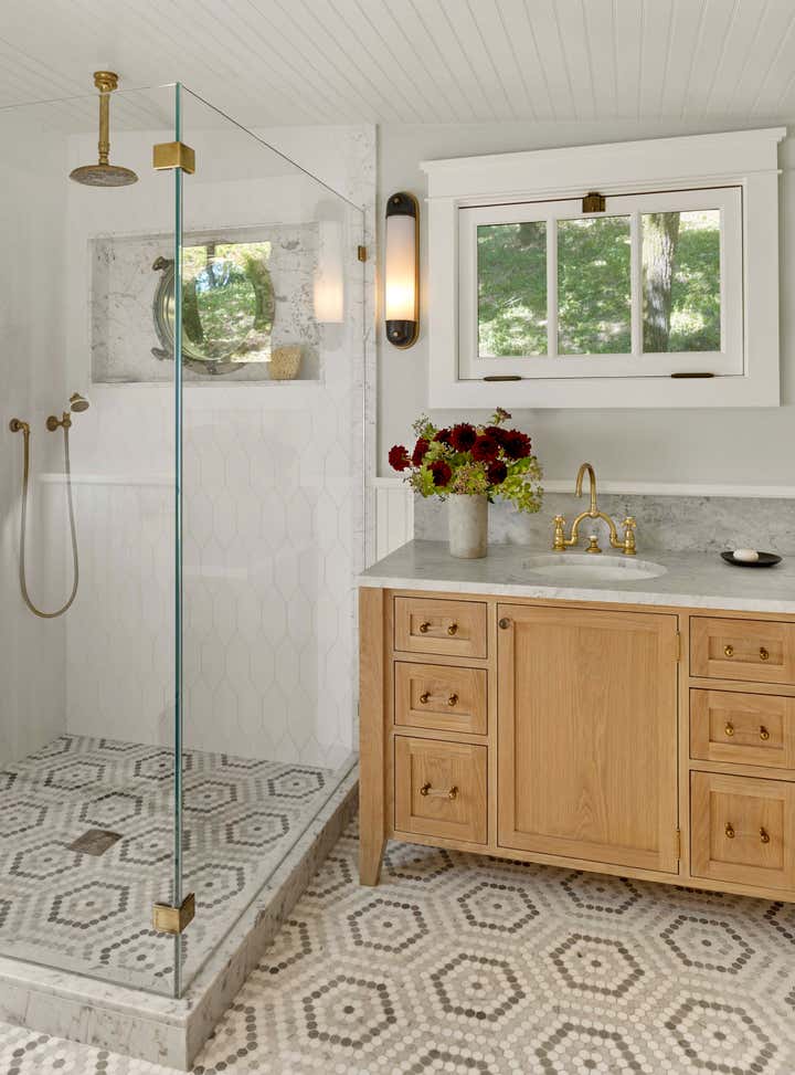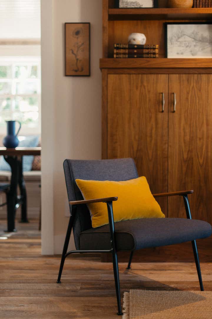 After owning this property for several years, the client, a busy, successful chef and restaurateur, was finally ready to take on a proper remodel of both the main house and a historic shed, formerly owned by a surviving member of the Donner family, of the eponymous ill-fated wagon train. JKA began with the shed, converting it to a master suite cottage, with a wine cellar and laundry below. In the main home, all trim and floors were replaced, box beam ceilings added, and an expansive, open kitchen with a large island was built. Portions of a wide, wraparound porch were repurposed as a second guest room on one side -- a charming screened-in "sleeping porch" -- and a formal dining room on the other side of the home, close to the kitchen. A pair of mirror panels above the cottage bath retract into pockets, revealing a window with a view onto the hillside -- and just outside the door of the cottage bath is a discreet outdoor shower. The furnishings evoke the casual aesthetic of California style and mix contemporary and rustic elements -- cultivating an atmosphere ideal for relaxation, rejuvenation, good food, and cocktails.