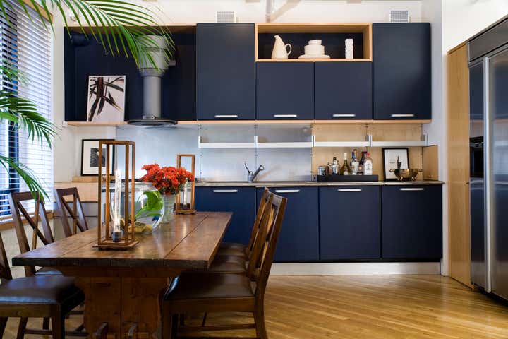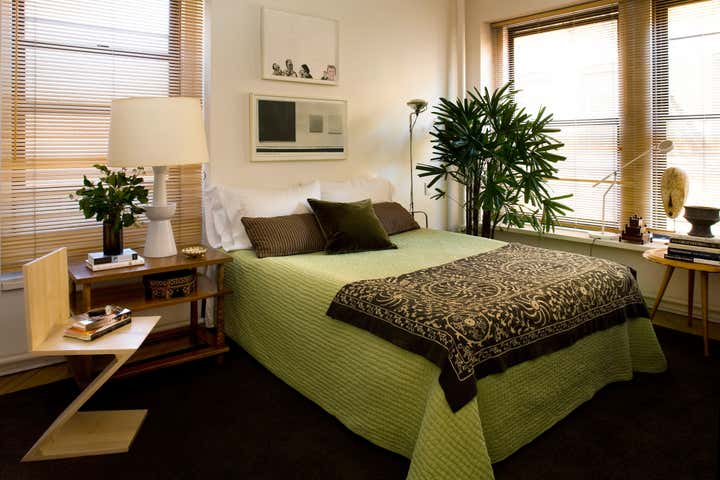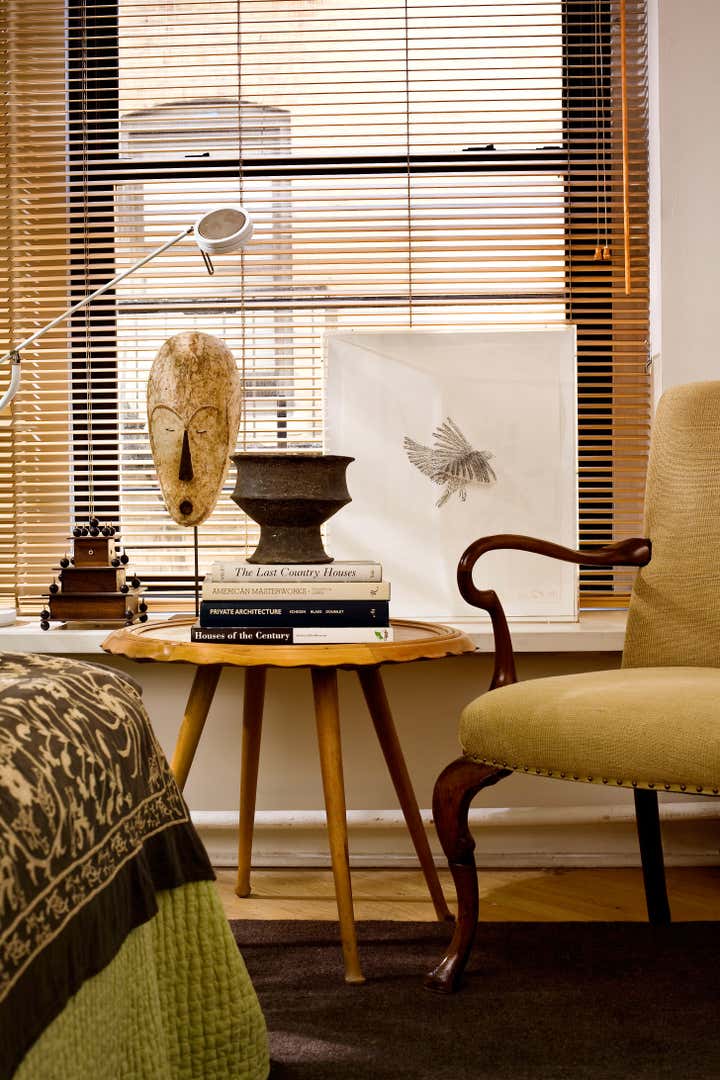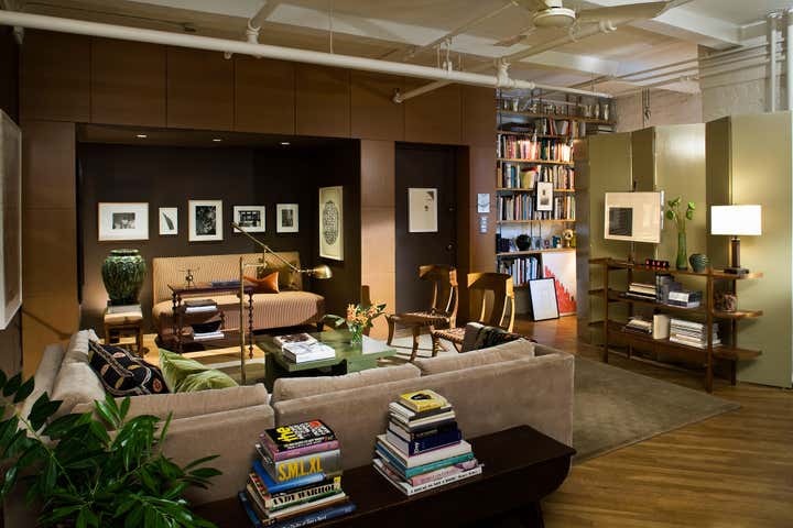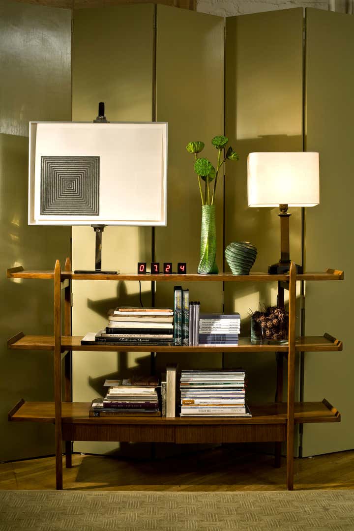 This loft in Chelsea, owned by Glenn Gissler, was a place of design ferment and experiment, an arena for working out long-held design convictions and exploring completely fresh modes of decorative expression. Deep wall colors create a rich, shadowy atmosphere in the main living room, yet other spaces are equally notable for bursts of natural light, a chiaroscuro that informs all of Glenn’s work. Collections of photographs and contemporary works on paper abound, along with piles of art and design books. We see certain Gissler signatures– Rietveld’s Zig-Zag chair; Christopher Dresser’s metalwork and green-glazed pottery–but there are new artistic elements as well. A Frank Stella black print from the 1970s vies with a plethora of stark, moody near-abstract black and white photographs. The loft represents a tension between the stability of well-loved furniture and objects and the restless desire for new knowledge which is the lot of every true collector and connoisseur. Amidst experiment, Glenn did not stint on comfort, which is, as much as his devotion to art, a Gissler hallmark. Velvety tufted sectional sofas invite the guest to take in and assimilate the wealth of art and objets which fill this space.