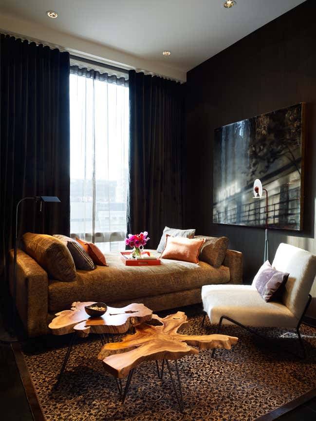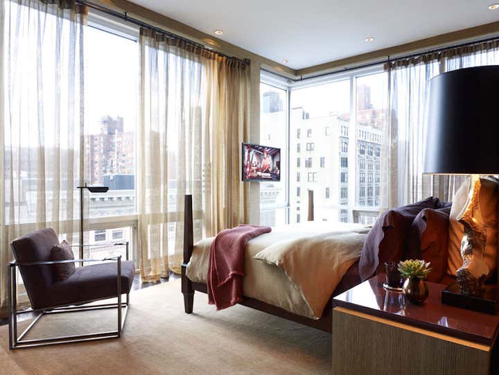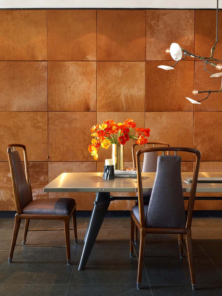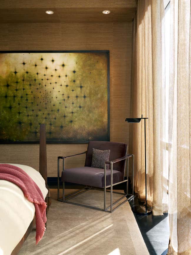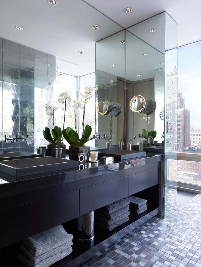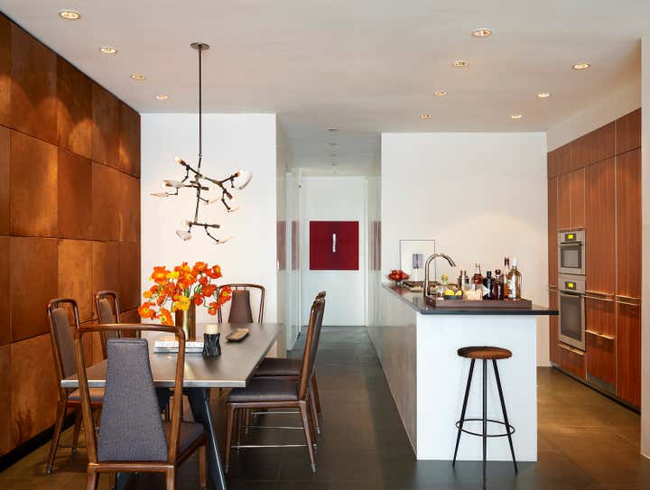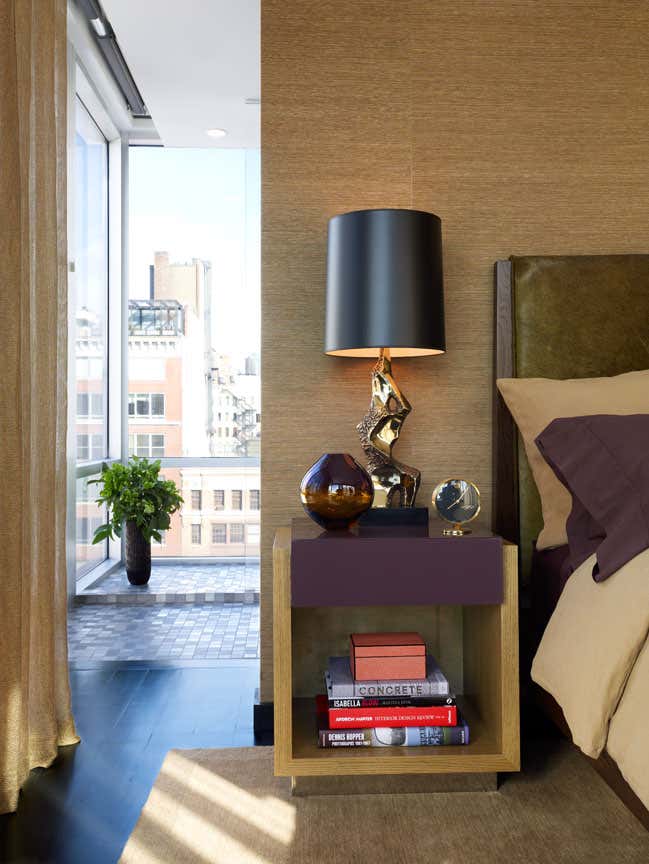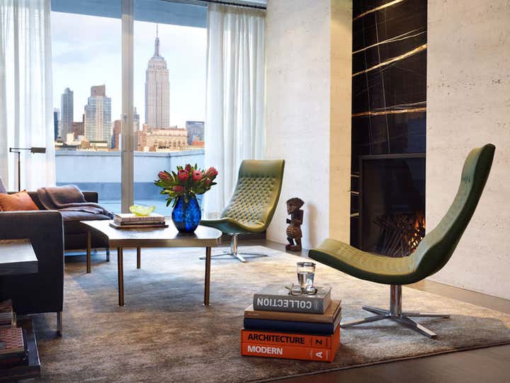 This loft exclusively occupies around 2,000 square feet on a high level floor in a small, privately owned building on the border of Chelsea and Greenwich Village. It boasts an impressive 500 square foot private deck oasis off the main room set away from the bustling city streets, featuring grand views of the NYC skyline and the Empire State Building. Bradley made the most out of every inch of this space with plush, elegant finishes and ingenious hidden storage solutions. His upgrades include black granite floors, a pony hair tile wall, aluminum tile master bath and a fireplace wall featuring travertine and marble panels. Bradley designed several pieces of furniture for this space, including the master bed, master nightstands, guest bed and dining room chairs. He customized a Lindsey Adelman chandelier and placed it above a Prouvé brushed stainless steel dining table. A black lacquered and antiqued copper Robert Kuo checkered screen partially separates the dining space from the main living room. A Minotti sectional, a pair of custom-leather Scott & Cooner lounge chairs and an Italian mid-century mosaic coffee table sit on an opulent silk Fort Street floor covering. Bradley maximized functionality with aesthetically profound design in every room. From the combination guest bedroom and office to the unique master bath, he artfully utilizes interior space. Each room is a collection of vintage and modern furniture assembled for their beauty and function, denoting the sophistication and elegance of Bradley’s signature design view, “World Modern.”