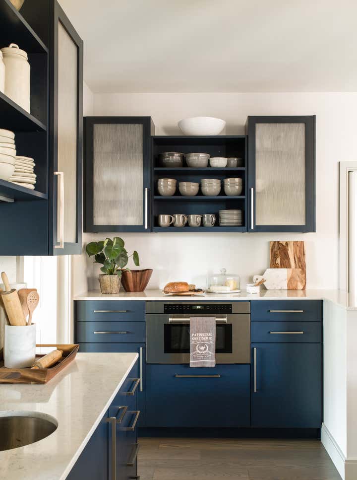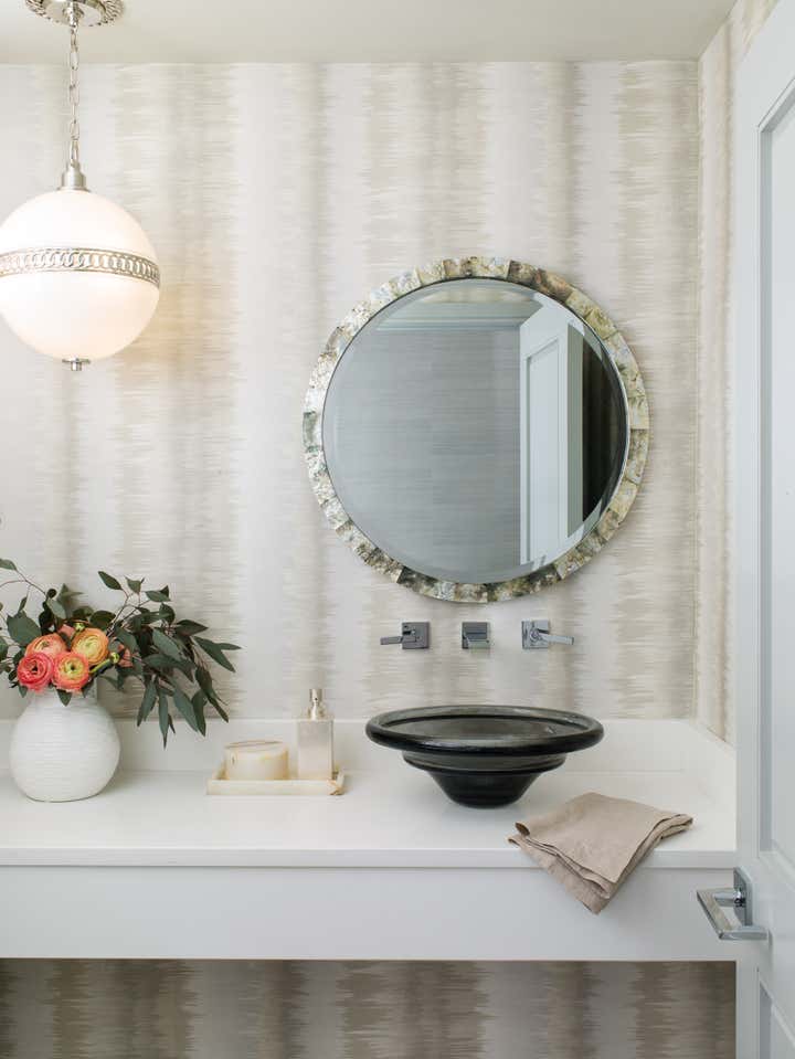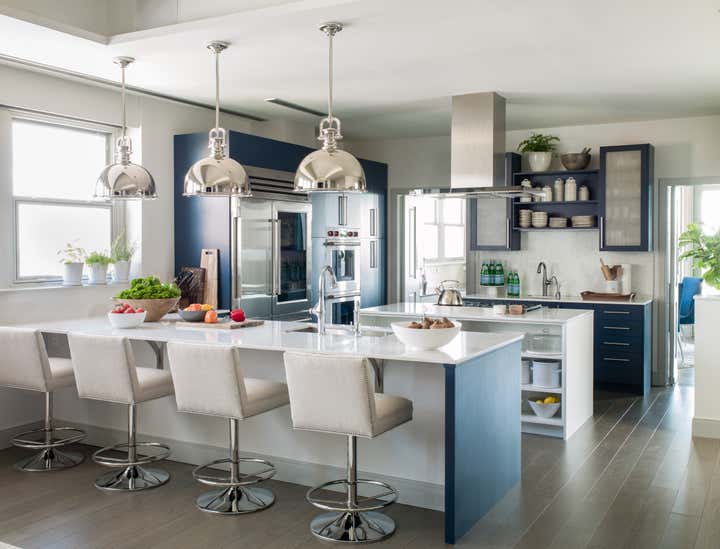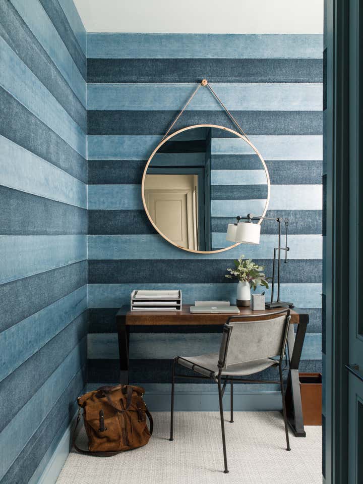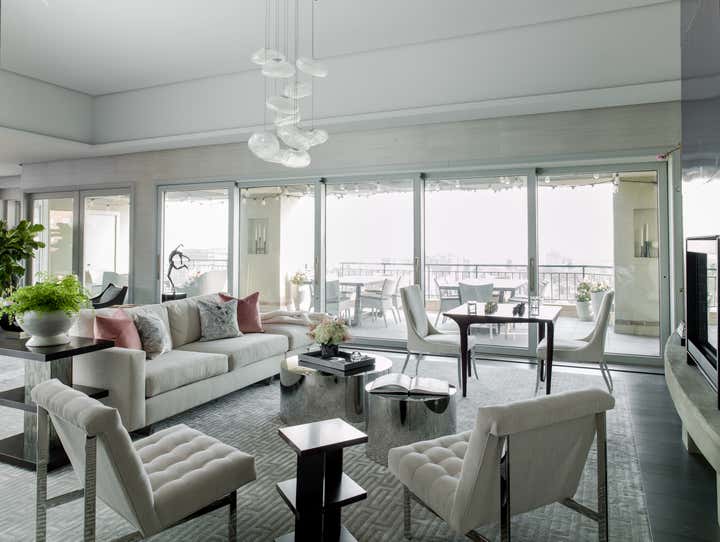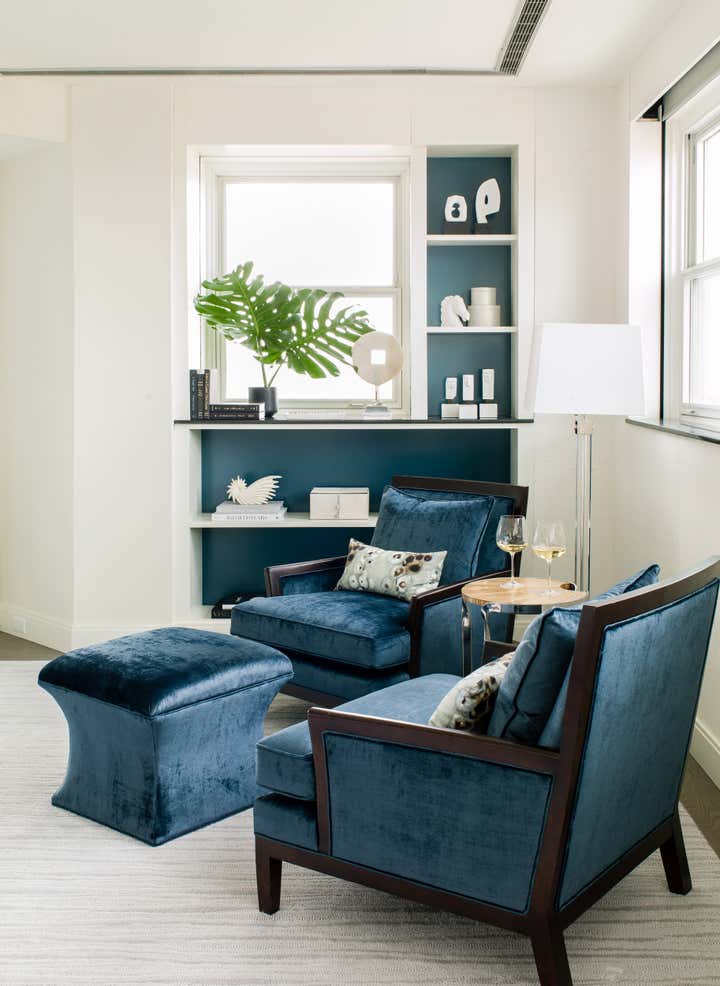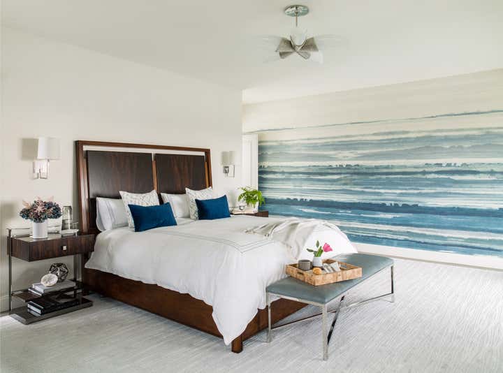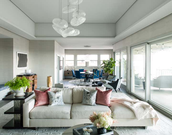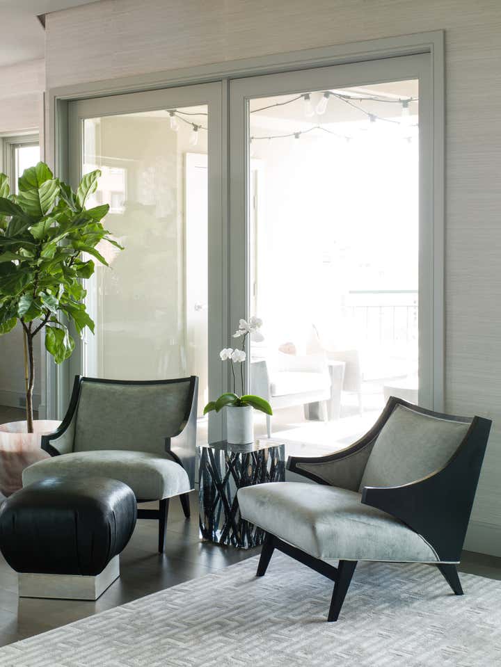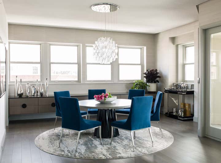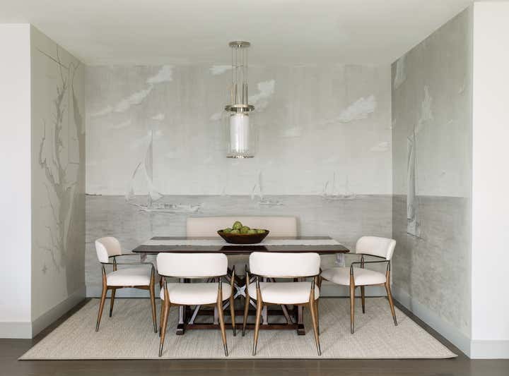 This project is in Baltimore and the Chesapeake Bay was a big inspiration for the general color scheme and feel of the space. It’s a penthouse condo and the main living space features a view of the beautiful gray-blue skyline, the color of which was pulled into the room for the walls for a sense of spaciousness. We designed this space to exude a sense of bespoke luxury with custom furniture, a hand-painted mural and unique vintage pieces, but still be livable and comfortable for entertaining and everyday living.