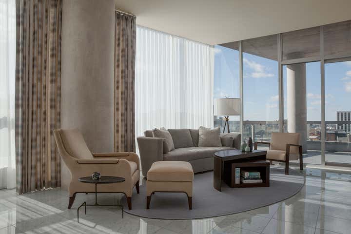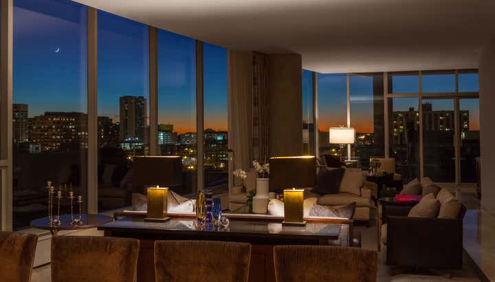 The modern interior of this downtown Chicago Penthouse embraces clean lines to highlight the spectacular view of the city.