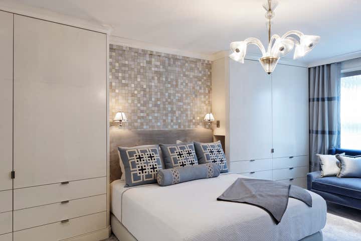 Undulating ceilings, plaster moldings and selective pieces of classical furniture all serve to create a modern but livable environment.