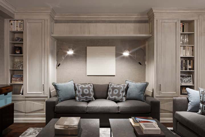 What do you for a client who loves 'white' and 'modern' but has to balance the needs of raising an active young family in a New York City apartment? The answer in this instance was adding greys and blues and comfortable seating throughout to counter-balance the severity of the backgrounds.