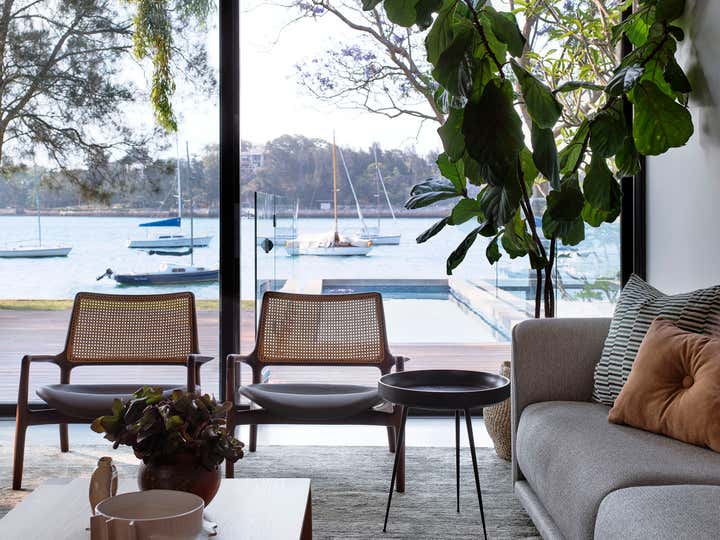 The Collector House feels wonderfully relaxed. Sunlight streams in from the central skylight and fills the rooms. The view of the harbour, framed by jacaranda and eucalypts, and the ferries passing by all contribute to the overall sense of calm. It’s a barefoot house – warm and grounded, with space for loved ones to gather. For this waterfront home Arent&Pyke worked with the building form, with its ply ceiling and concrete floor, to shape the interior architecture in ways that relate closely to both the harbourside site with its Australian flora and the client’s existing art collection. With its hints of Australian vernacular architecture, the interior is correspondingly robust and timeless.