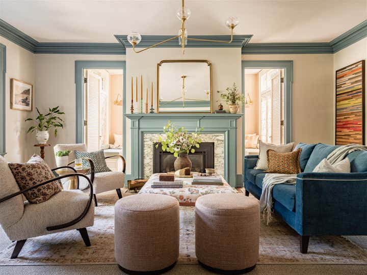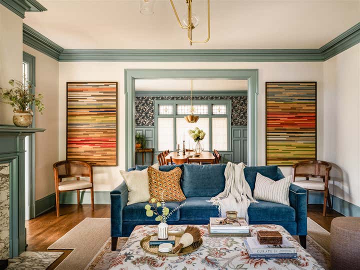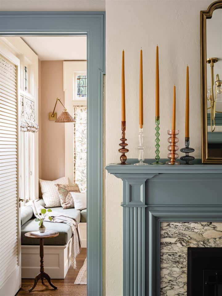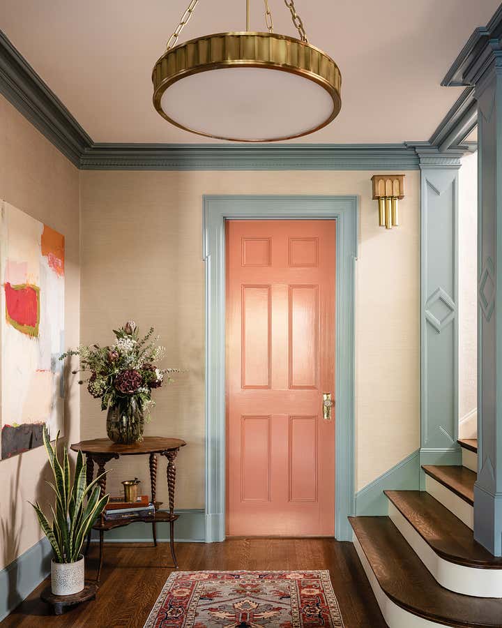 I flipped the script for how to work with clients who hesitate with color. The most common Rx is to keep everything neutral and deploy colors with the accents like pillows or throws. Here we harkened from the lessons learned with the stained glass – bringing color to the bones of the home, not the accessories. The millwork. The walls. And even the doors.