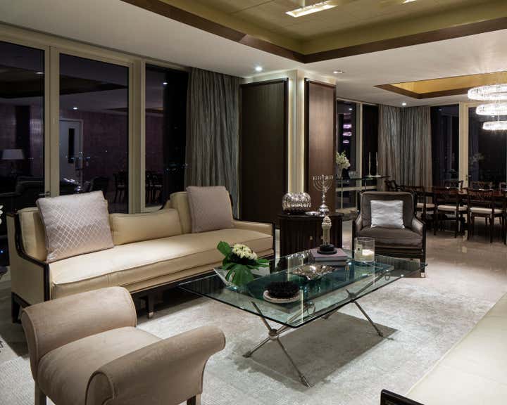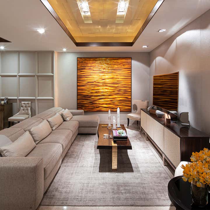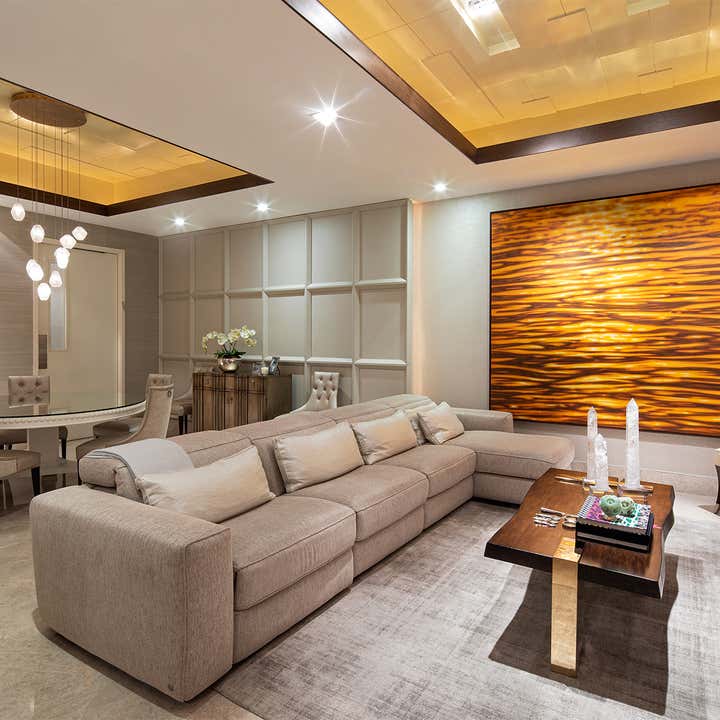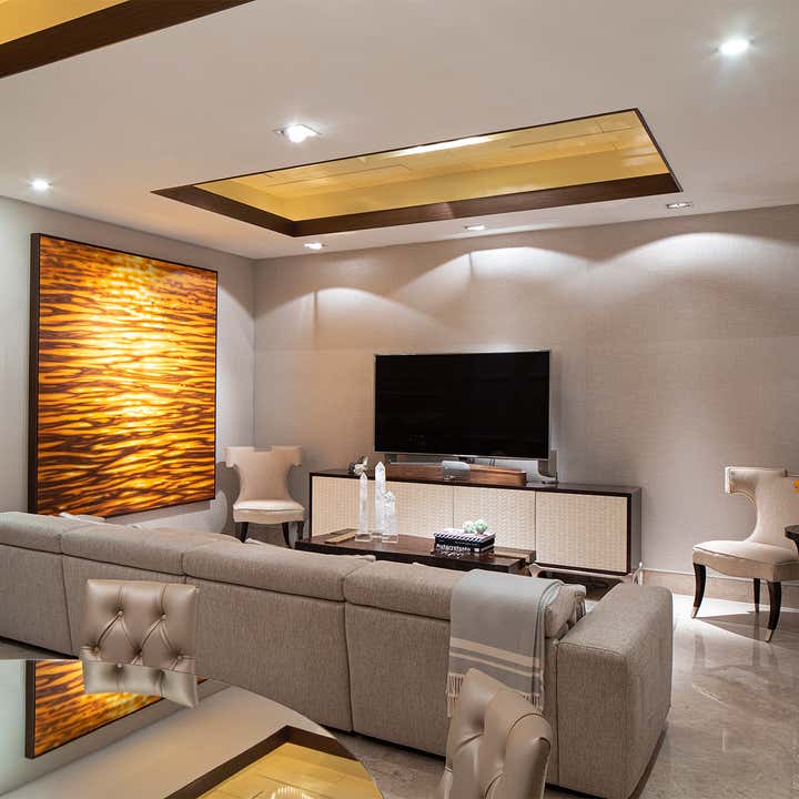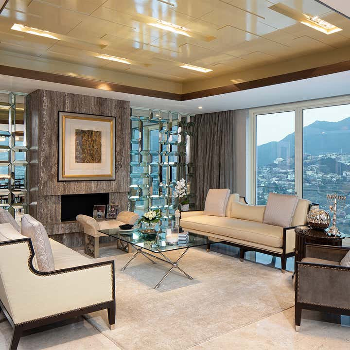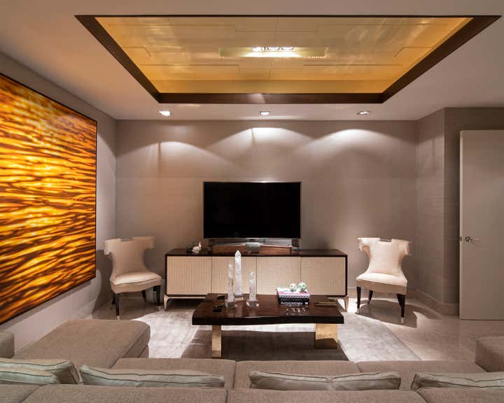 The ceilings in the social areas are beige lacquered wood with walnut trims.