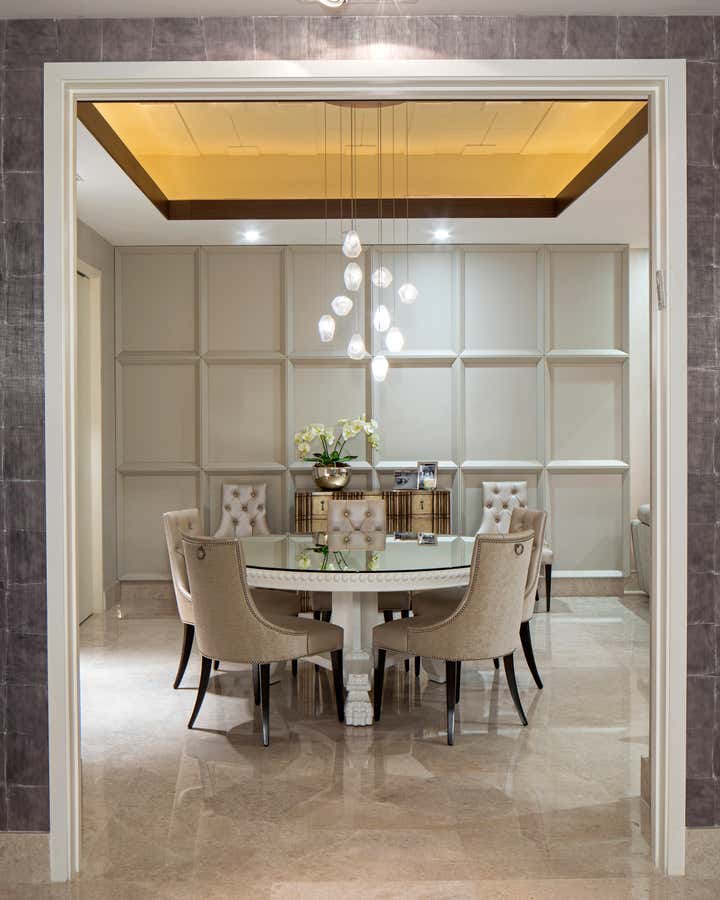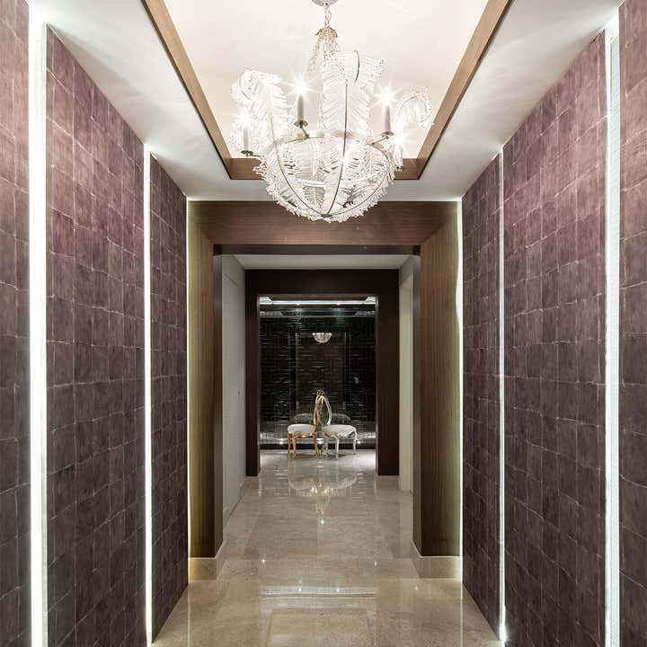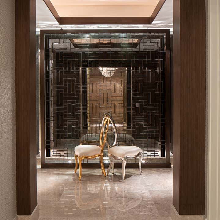We could not modify much of the layout, so we had some challenges to resolve. One of them was the long entry hallway. The solution was to build panels (with indirect lighting) to break the space visually and to conceal some doors as well. At the end of the hallway we used antiqued mirror with a steel screen in front of it.