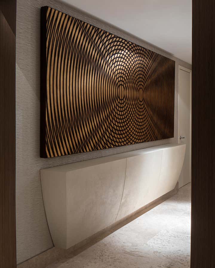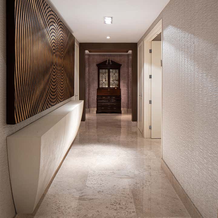 Art is a major point of this house, so we designed the project based on that. In the other long corridor of the house we installed a very large important painting and at the end, a secretaire that is a family heirloom.