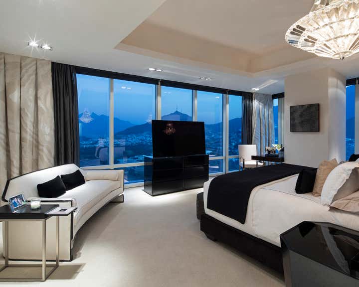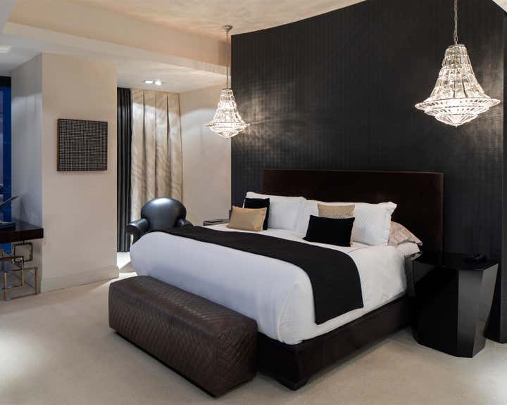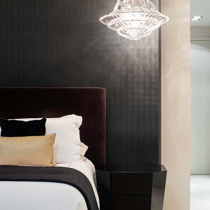 For the master bedroom the palette is monochromatic black and white, with a variety of textures like silk, mohair and velvet. The curved wall behind the headboard is upholstered in woven faux leather.
