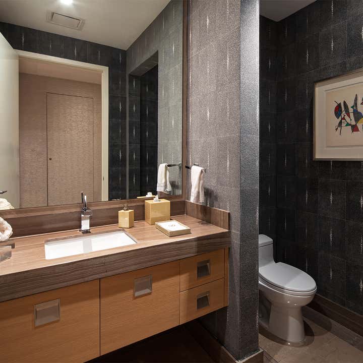 In the breakfast room we custom made framed panels covered in leather for the walls. The rest are either wallpapered or upholstered walls.